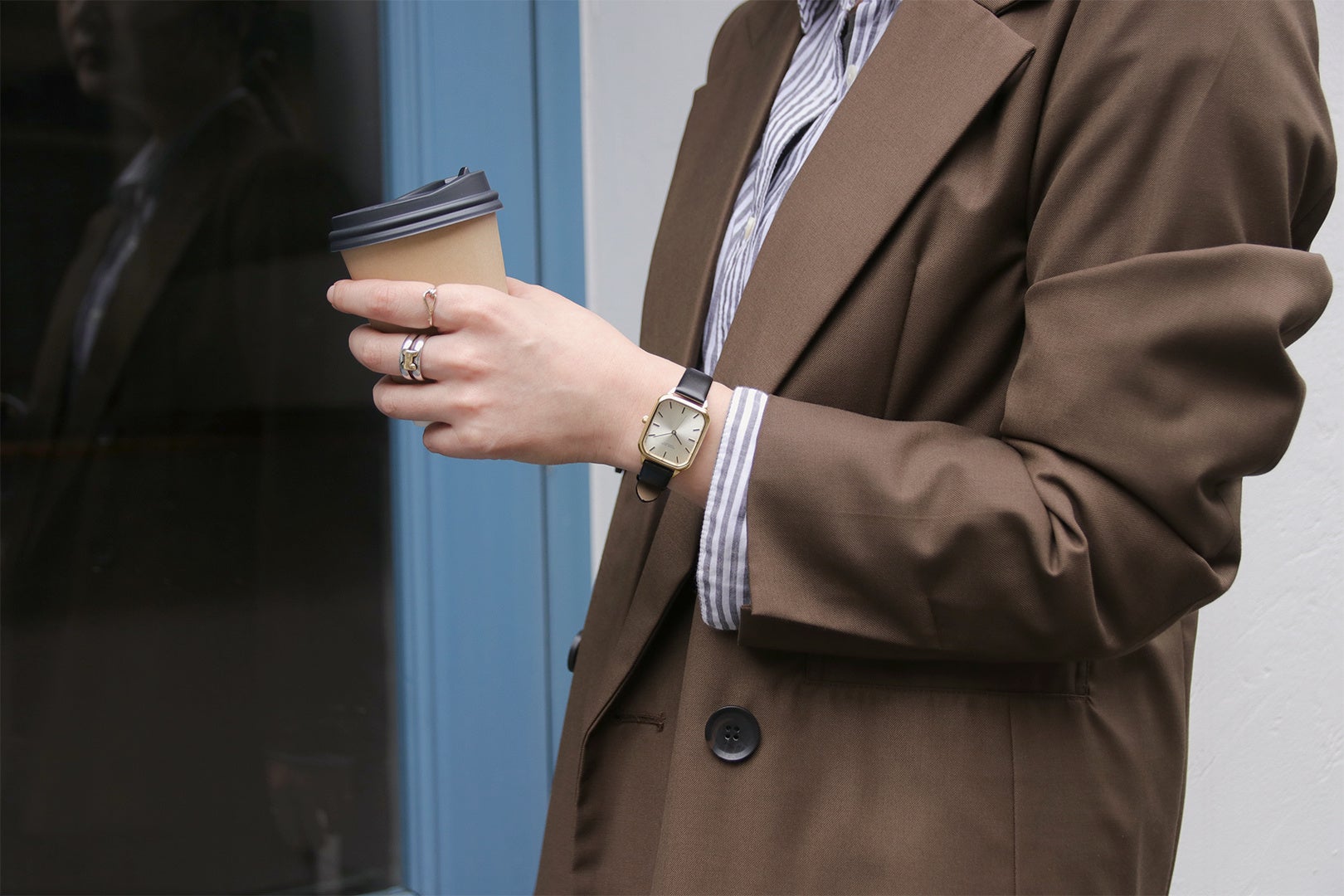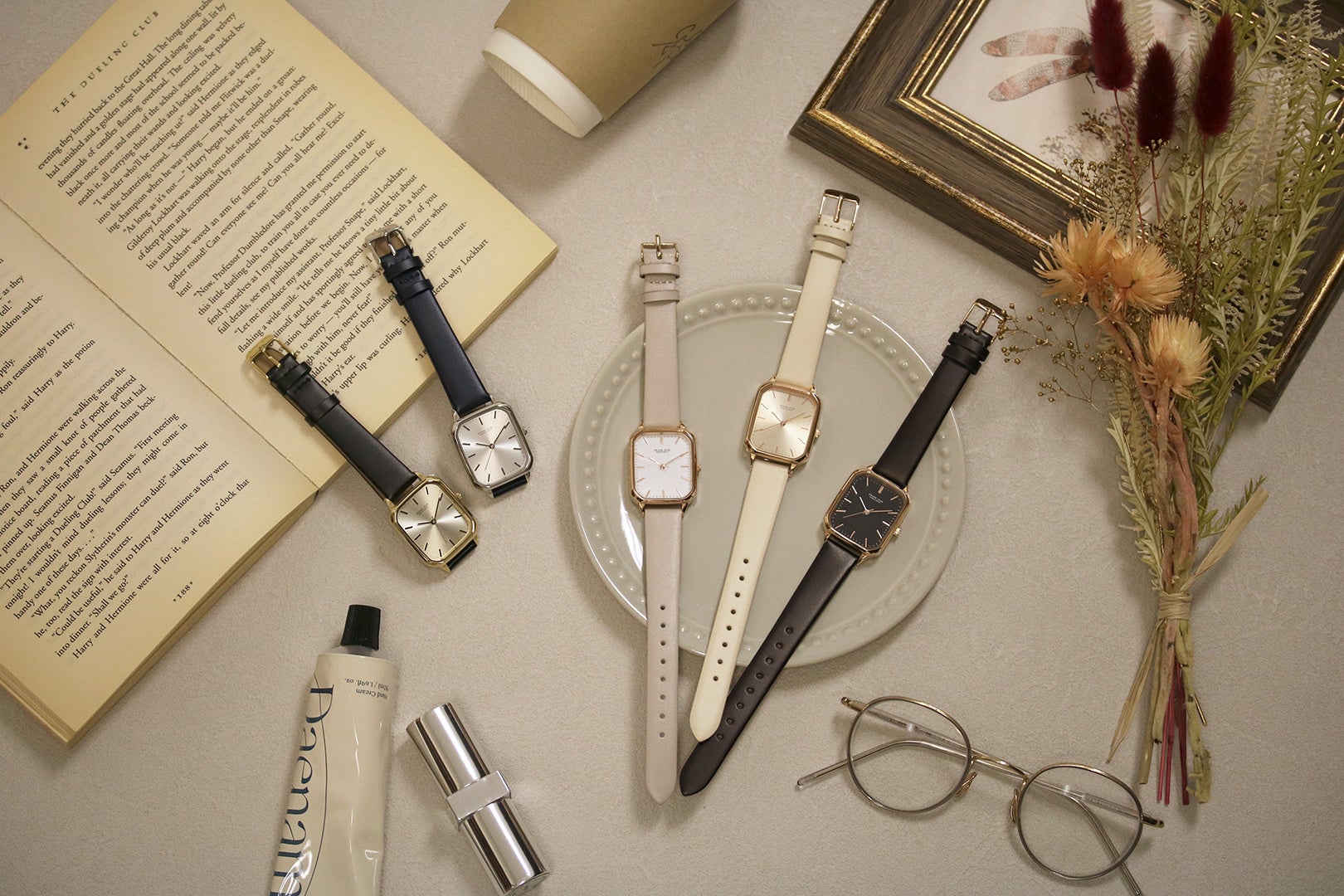 角を落としたクラシカルなレクタンギュラケースと絶妙なニュアンスカラーのレザーベルトが、かわいい系からカッコいいスタイルまで、さまざまなファッションに合わせやすい万能な1本。