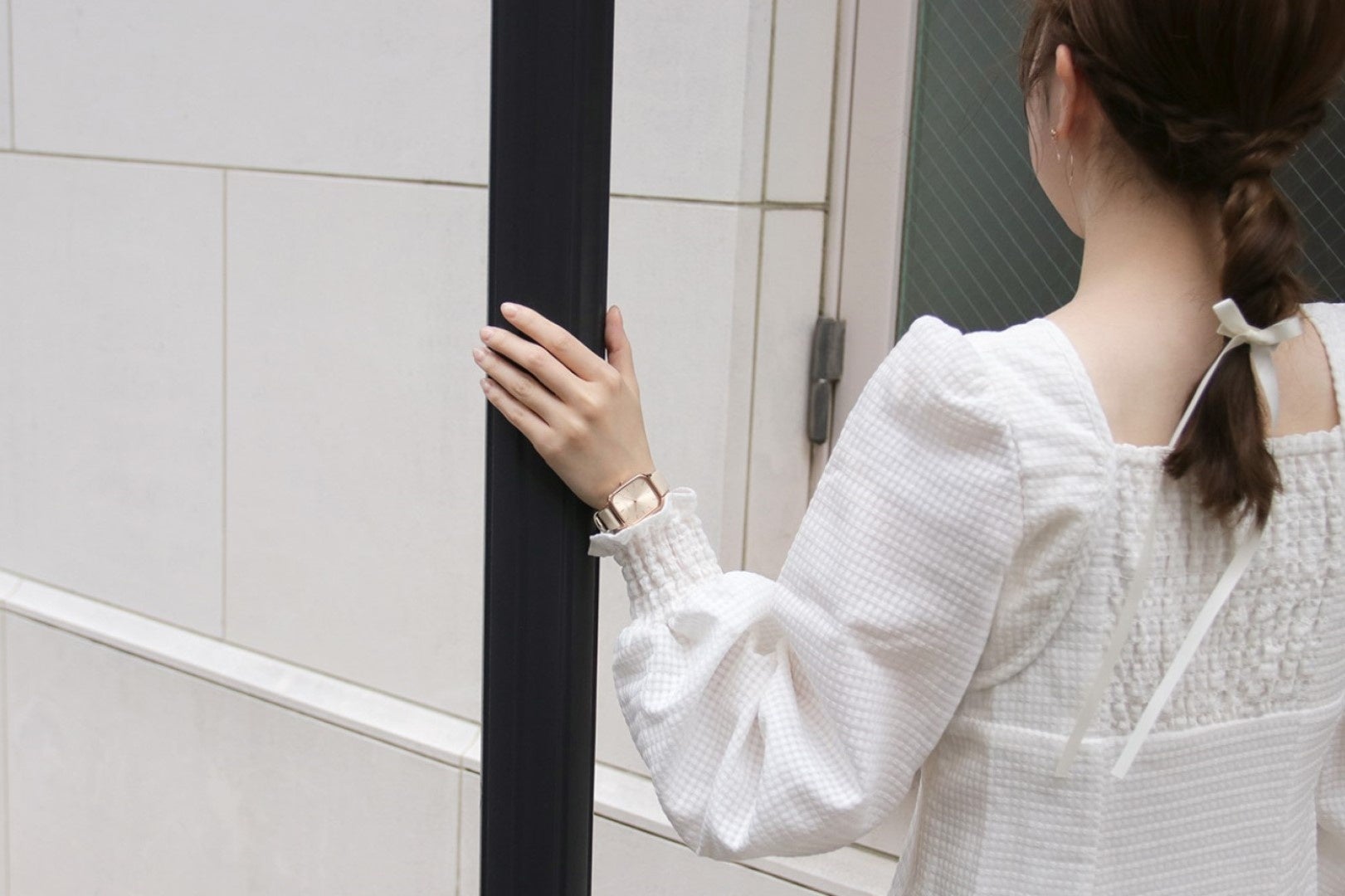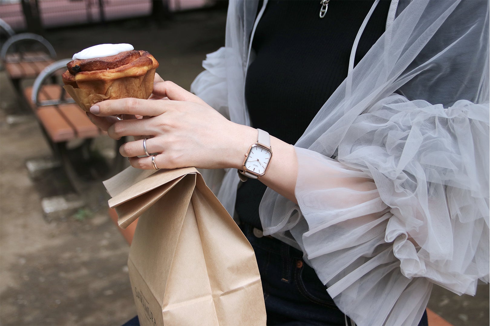 ニュアンスカラーの代表ともいえるグレージュレザーに、ピンクゴールドケースと落ち着いたホワイトの文字盤を合わせたモデル。キレイ目のトップスにチュールスリーブを合わせた上品なスタイリングはまさにピッタリで、気になっていたオシャレなパン屋さんに行きたくなるコーディネートの完成です◎