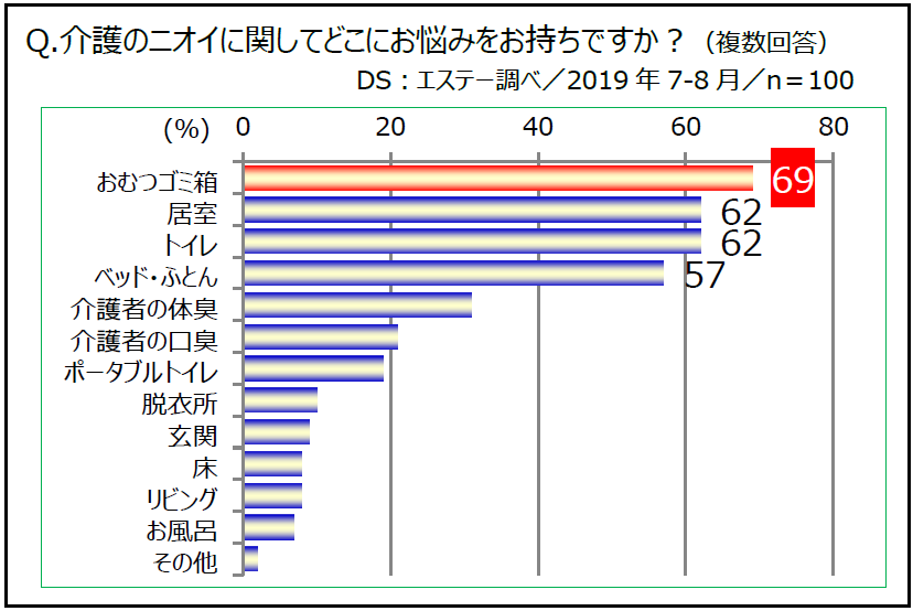 在宅介護者に「介護のニオイに関して、どこに悩みを持っているか?(複数回答)」を調査したところ、“おむつゴミ箱”が69%で一番多くなっています(下図)。使用済みおむつやパットを捨てる際には、80%以上の方が“ひとつずつ袋に入れる・数個まとめて袋に入れる”と回答していますが(※2)、時間が経つにつれてゴミ箱から漏れ出すニオイに悩まれている人が多いことが分かりました。