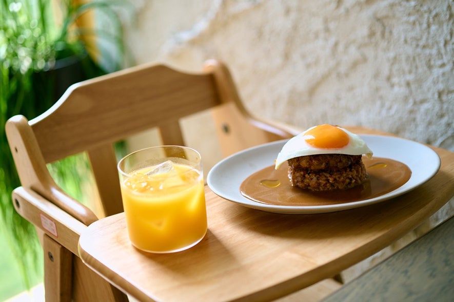 キッズ限定メニューのロコモコが新登場!グレイビーソースにデミグラスソースを混ぜ、お子様でも食べやすい味わいに仕上げました。ライスは食物繊維が多く含まれる十穀米を使用し、健康バランスに配慮。ごろごろハンバーグの上に乗った半熟たまごを崩しながらお召し上がりください。