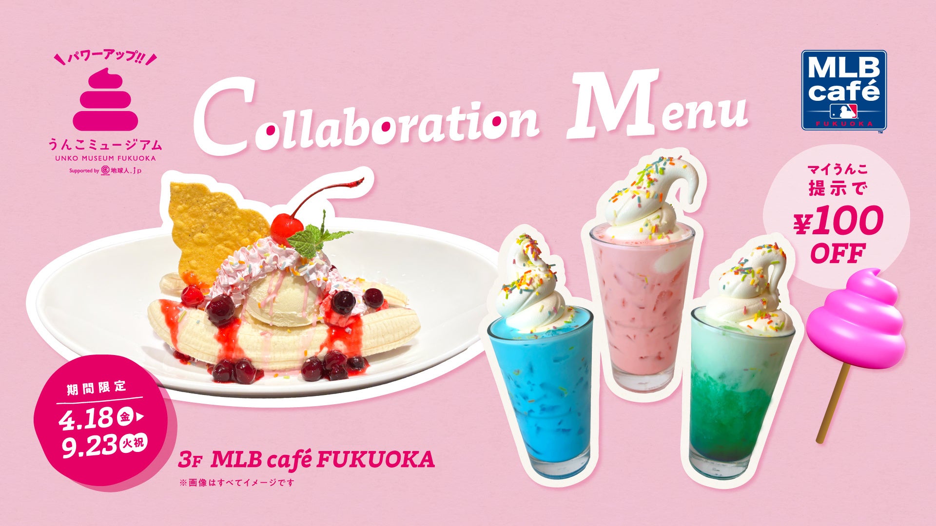 キャンペーン期間中、3F「MLB café FUKUOKA」で販売中のうんこミュージアムコラボグルメを「マイうんこ」をご提示で通常100円オフのところを200円オフでご提供いたします。