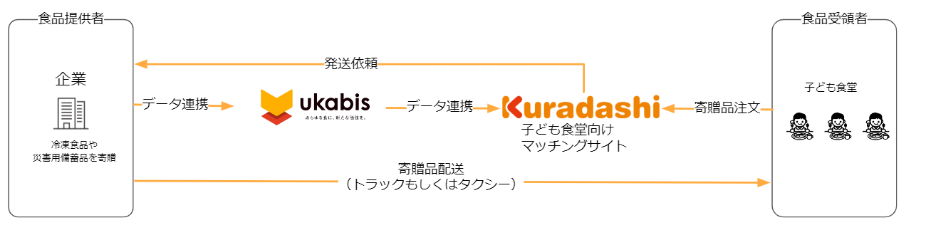 各企業が保有する商品の情報をukabisに登録し、データを連携することで大阪府内の子ども食堂と食品のマッチングを行います。マッチングされた食品は、提供元企業の保管先からトラックもしくはタクシーを活用し各子ども食堂へと提供されます。