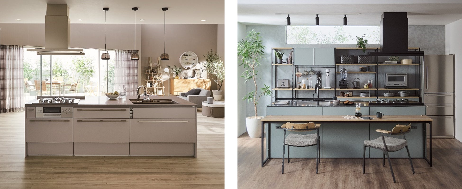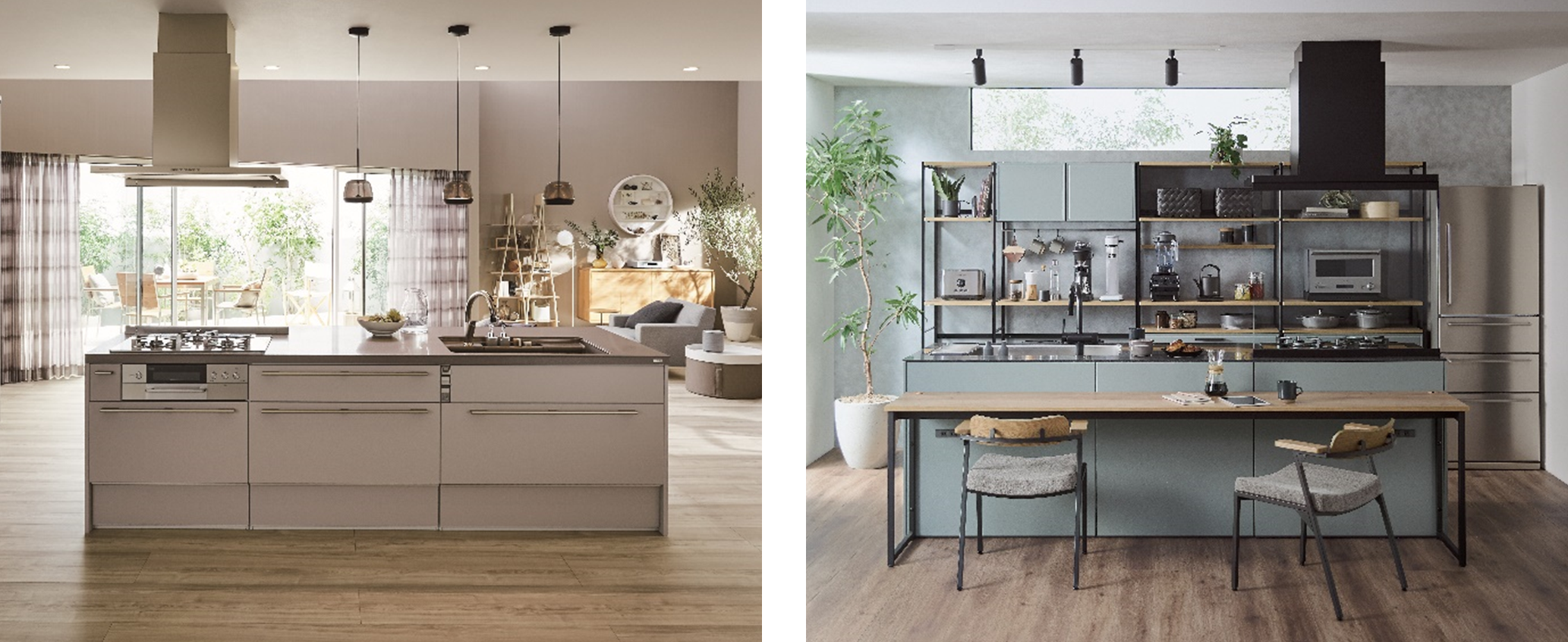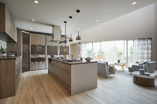 プロダクトディティールと空間コーディネートの双方向からデザインにこだわった、暮らしを魅せるシステムキッチンです。ノイズを抑えた人造大理石のワークトップデザインは空間に主張しないので、従来のキッチンイメージとは異なり、家具のような印象を与えます。