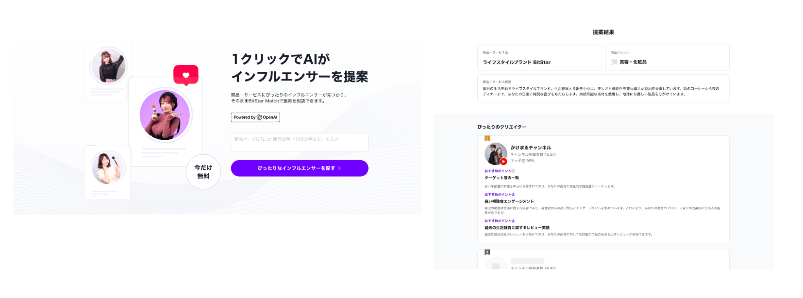 ・インフルエンサーマーケティングプラットフォーム「BitStar Match」:https://bitstar.tokyo/match