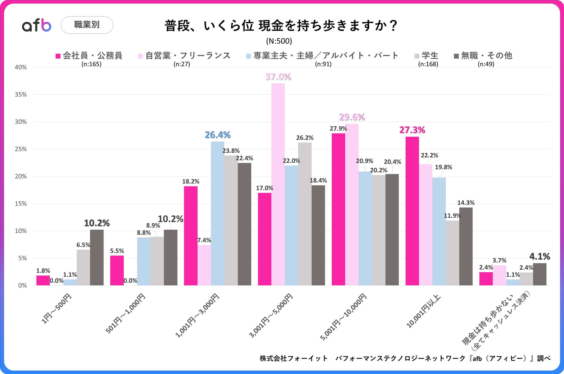 職業別で見ると、お小遣いやアルバイトが収入源となる学生は、1,000円から5,000円程度を持ち歩く方が多い一方で、会社員・公務員の場合は「10,001円以上」と回答した方が30%近くになるなど、職業によって持ち歩く現金の額に差が生まれていることが伺えました。