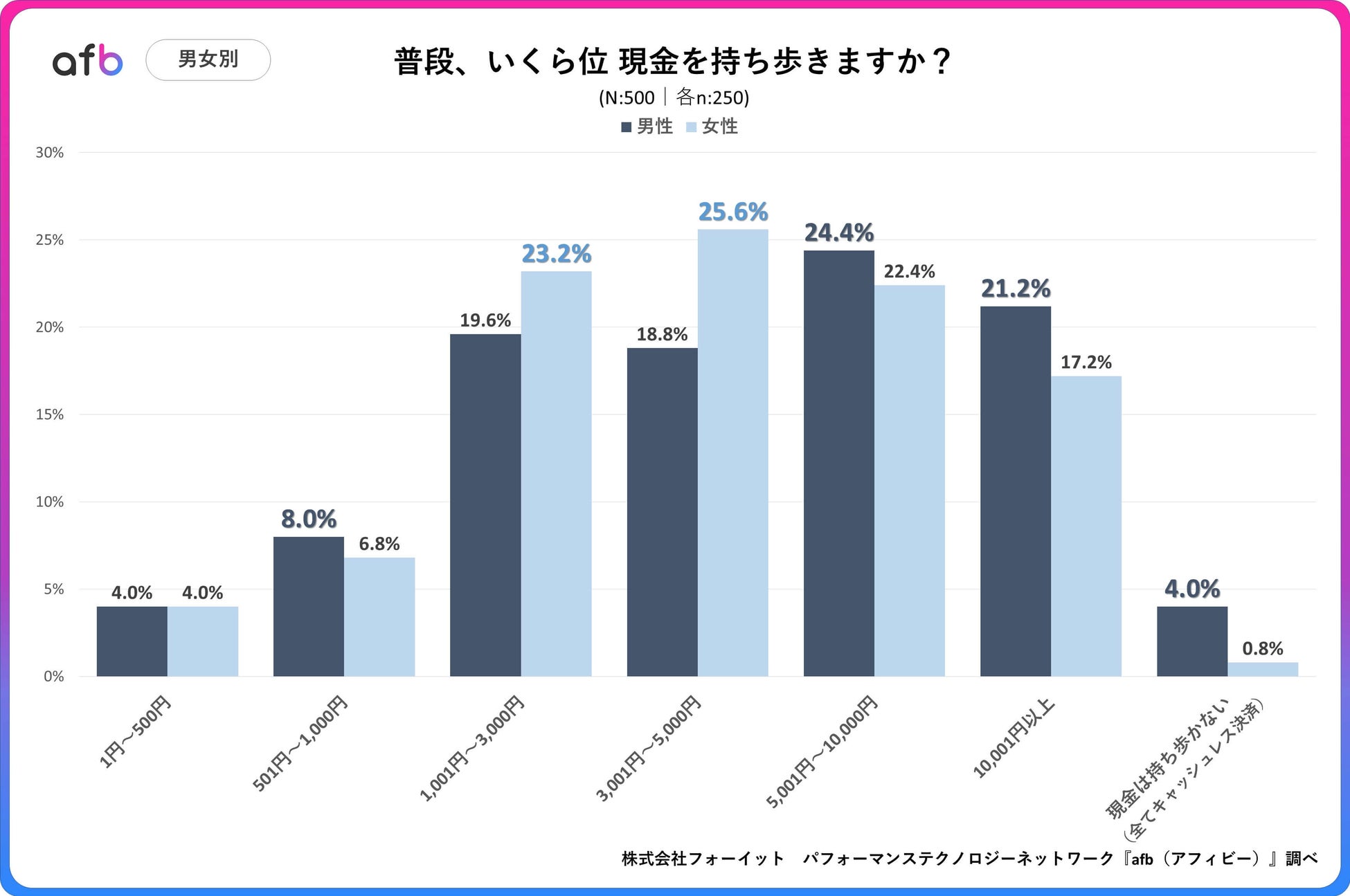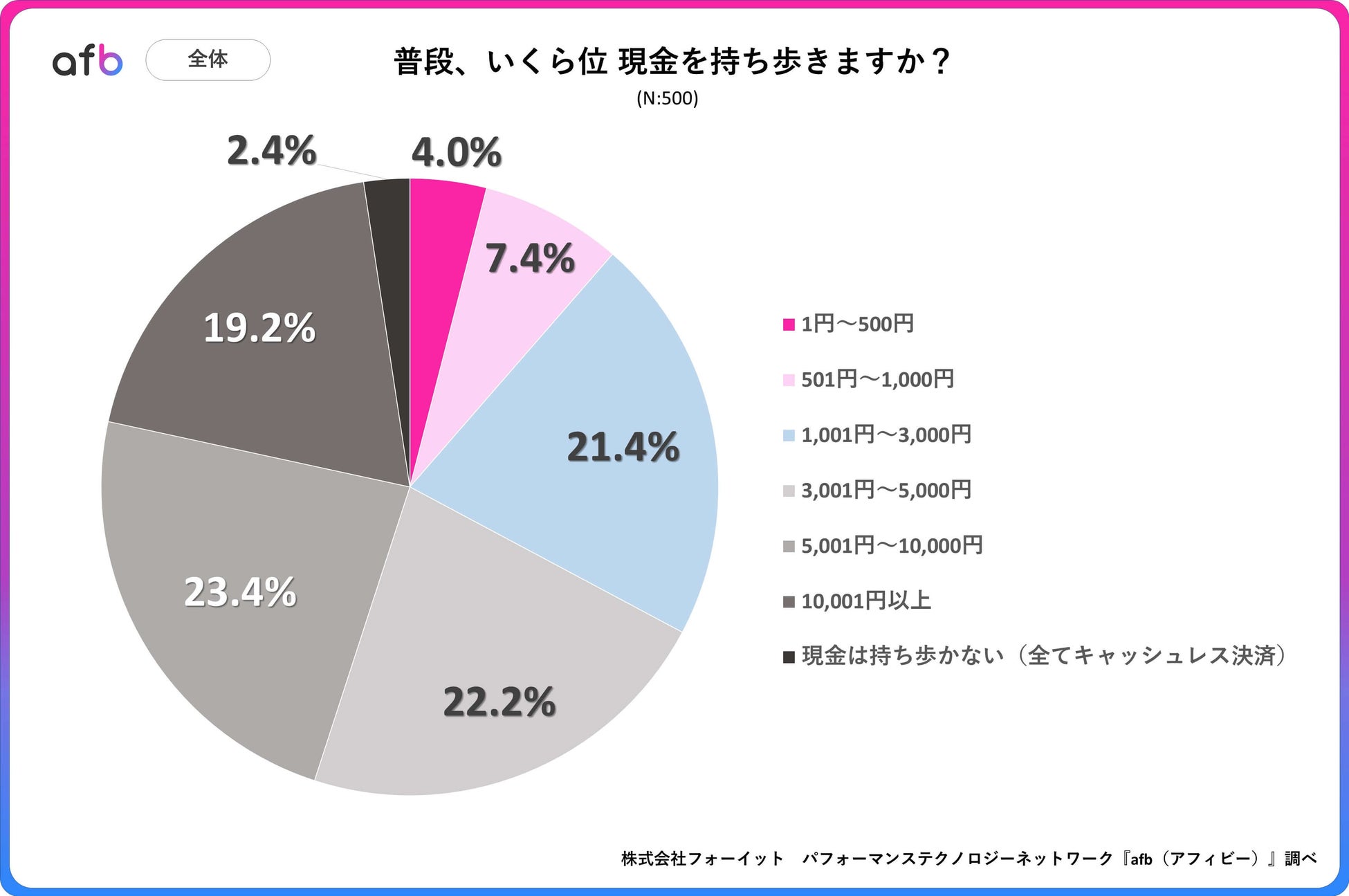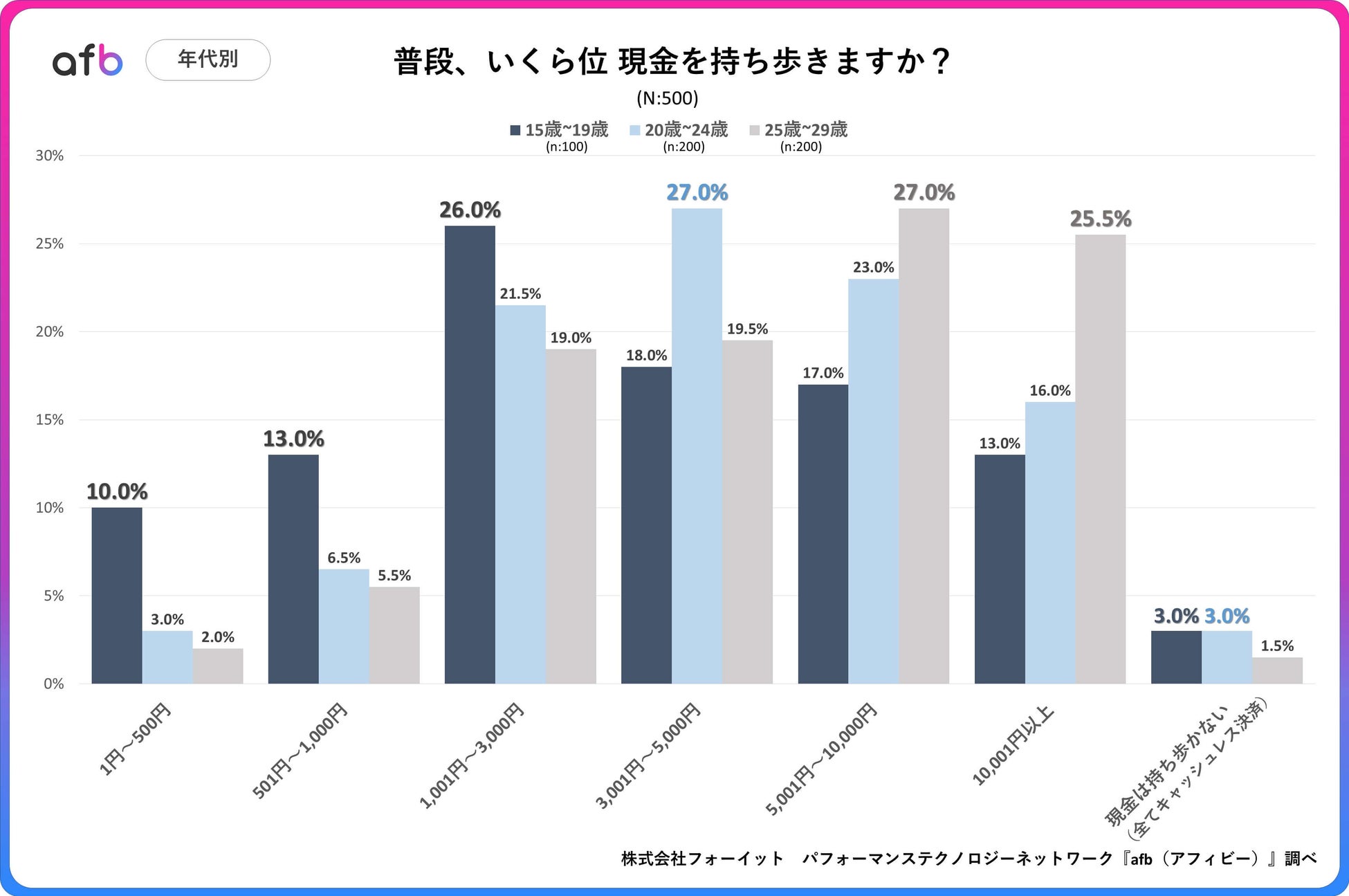 パフォーマンステクノロジーネットワーク「afb(アフィビー)」< https://www.afi-b.com/ >の開発運用をおこなう株式会社フォーイットは、全国の15歳~29歳までの男女500人を対象にお財布の現金に関するアンケートを実施し、年代別等の特徴についてまとめました。