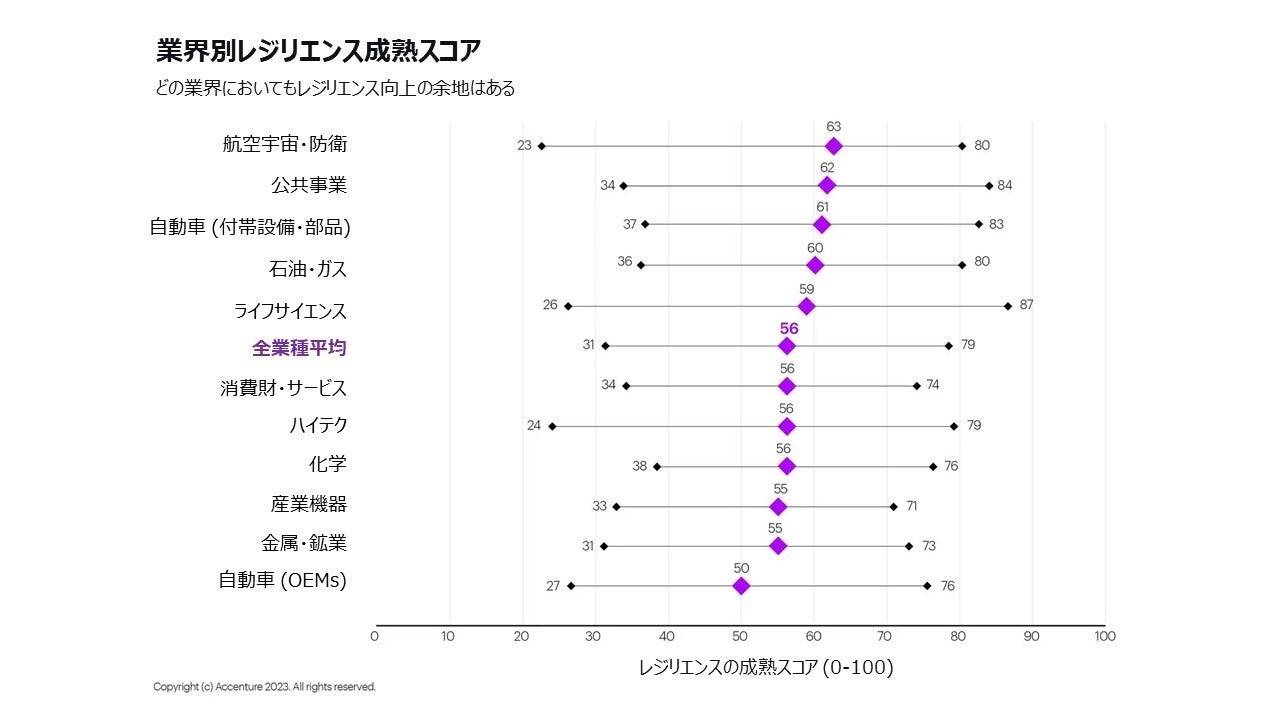 持続的なレジリエンスの獲得は、多くの企業にとってまだ遠い先の展望です。本調査の一環として、アクセンチュアはエンジニアリング、供給、生産、オペレーションのレジリエンスを0~100の尺度で測定するモデルを開発しました。その結果、平均スコアはわずか56でした。