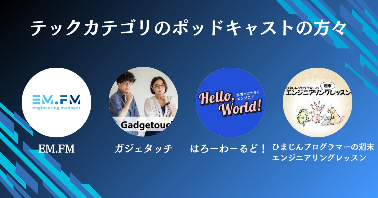 また、Voicyで聴けるポッドキャストにテック領域の方々が加わりました。Voicyだけで発信されているエンジニアの方々の放送とあわせて、Voicy内で一緒にお聴きいただけるようになっています。