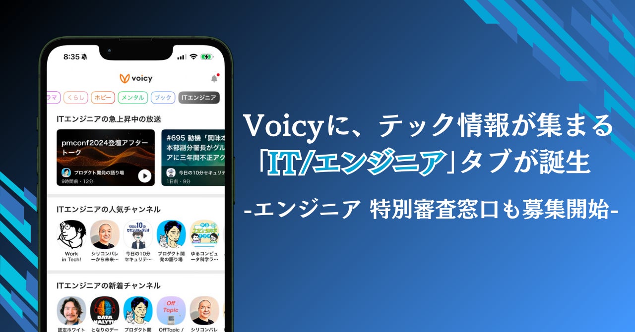 株式会社Voicyが運営する音声プラットフォームVoicyは、音声配信におけるテック領域の発信、関心が増している状況を受け、12月12日(木)より「IT/エンジニア」タブを新設しました。Voicyアプリ内に新しくつくられたこの「IT/エンジニア」タブは、エンジニアによる技術情報やIT現場の裏話など、テック領域の専門性の高い放送が集まる場所となります。