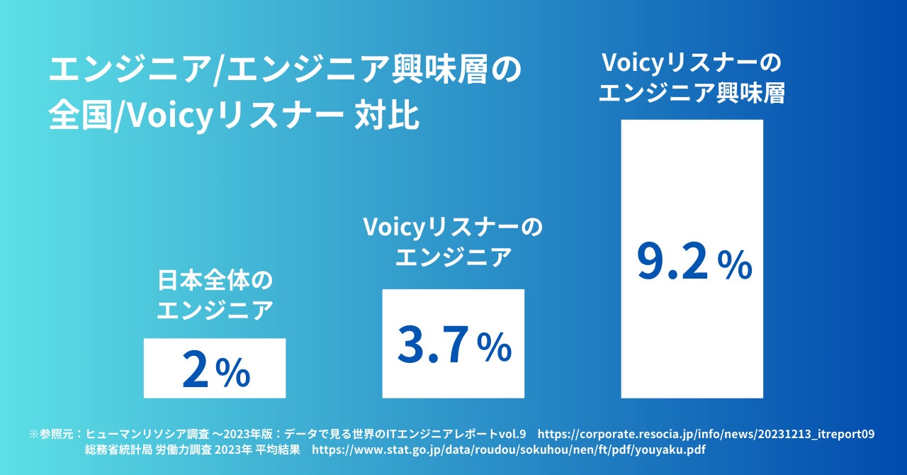 また、すでにエンジニアとして仕事をされている割合に関しても、日本全国の労働人口に占めるエンジニア割合が2%なのに対して、Voicyリスナーのエンジニア割合は3.7%と高くなっています。