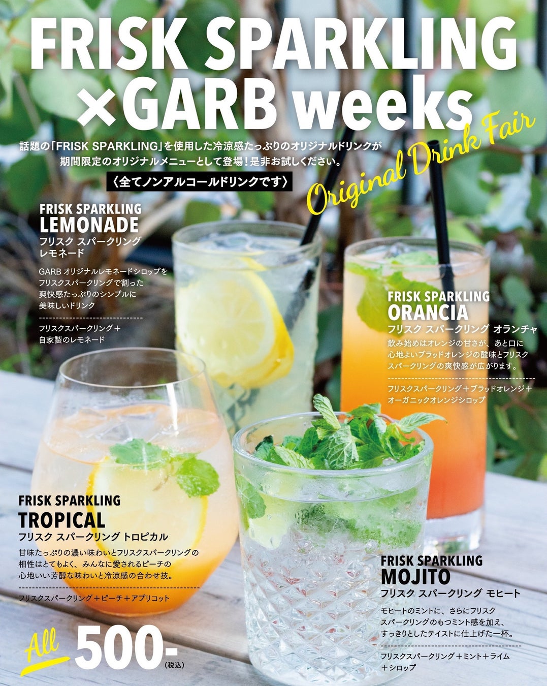 株式会社バルニバービ(本社:大阪市西区、代表取締役会長:佐藤裕久) は、大阪・中之島のピッツァリア、トラットリア・カフェ「GARB weeks(ガーブ ウィークス)」(所在地:大阪市北区中之島1-1-29 中之島公園内 )にて、ダイドードリンコ株式会社(本社:大阪市北区、代表取締役社長:中島孝徳)の新商品「FRISK SPARKLING(フリスク スパークリング)」を使った、ノンアルコールドリンク4種を9月30日(月)までの期間限定で提供しております。