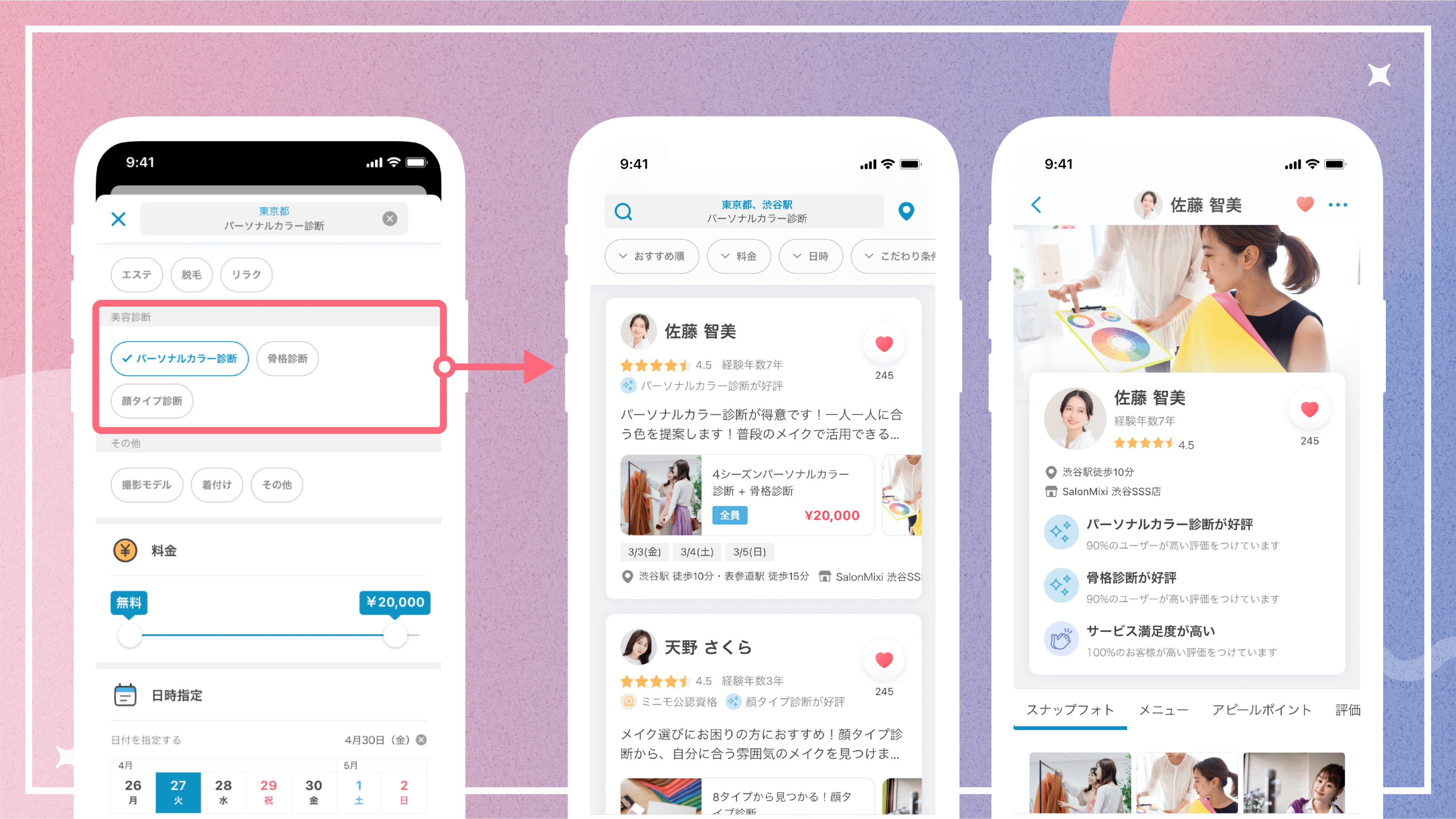 本日より新設された「美容診断」カテゴリ内には、パーソナルカラー診断、骨格診断、顔タイプ診断のメニューがあり、ミニモ上で診断士を検索して直接予約が可能になります。
