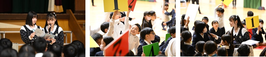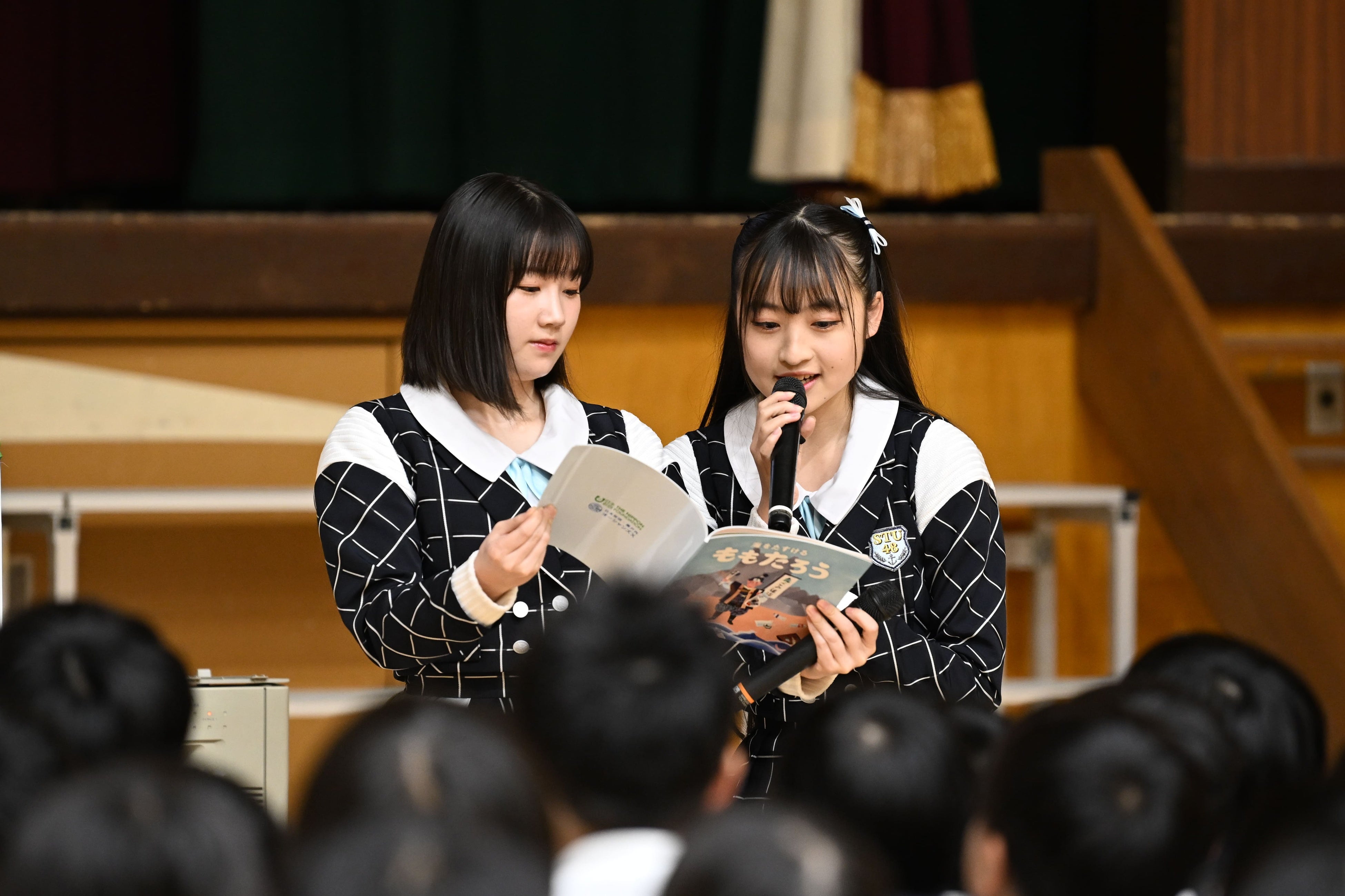 STU48メンバーが小学2年生の生徒約100名に「海をたすけるももたろう」を読み聞かせ。