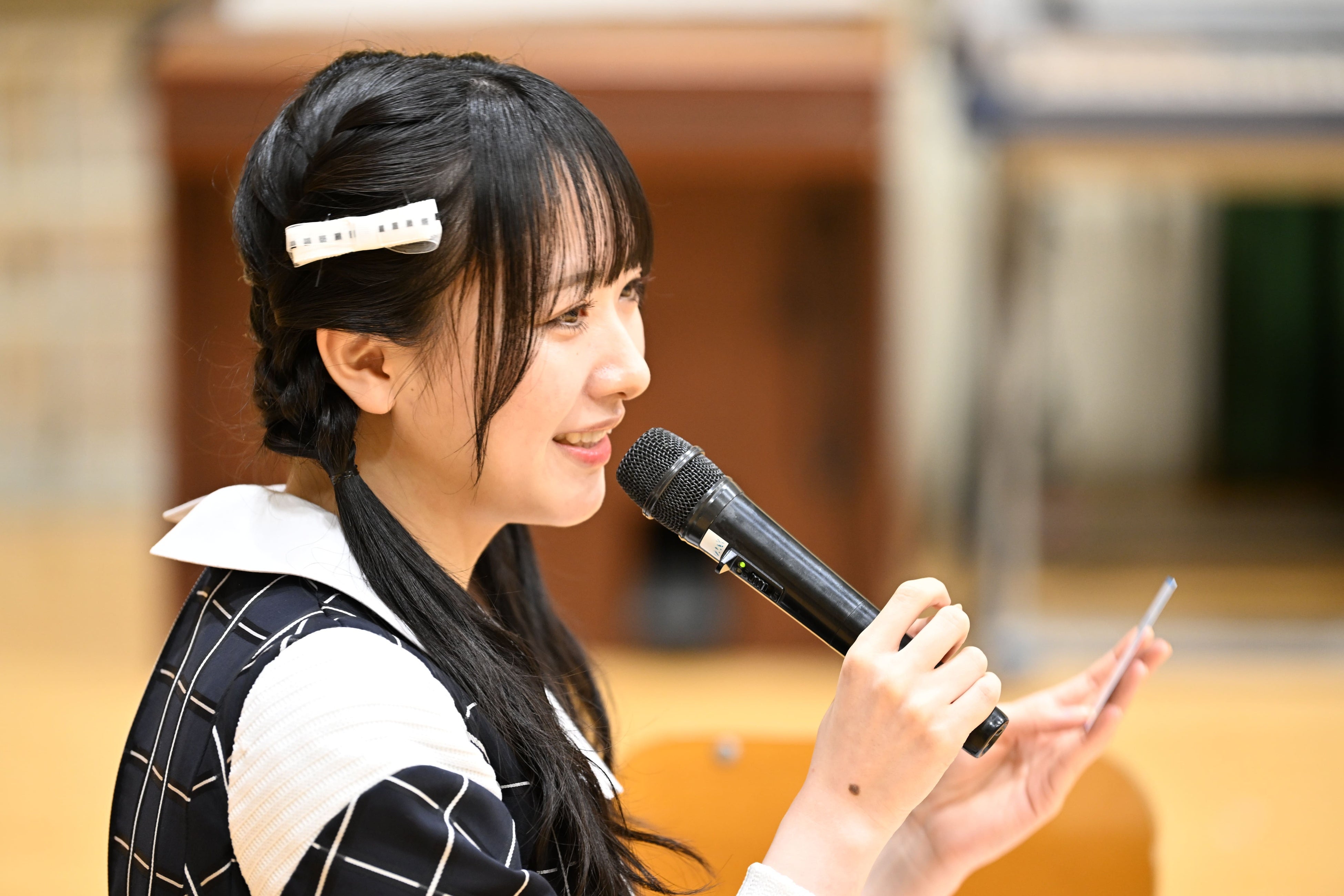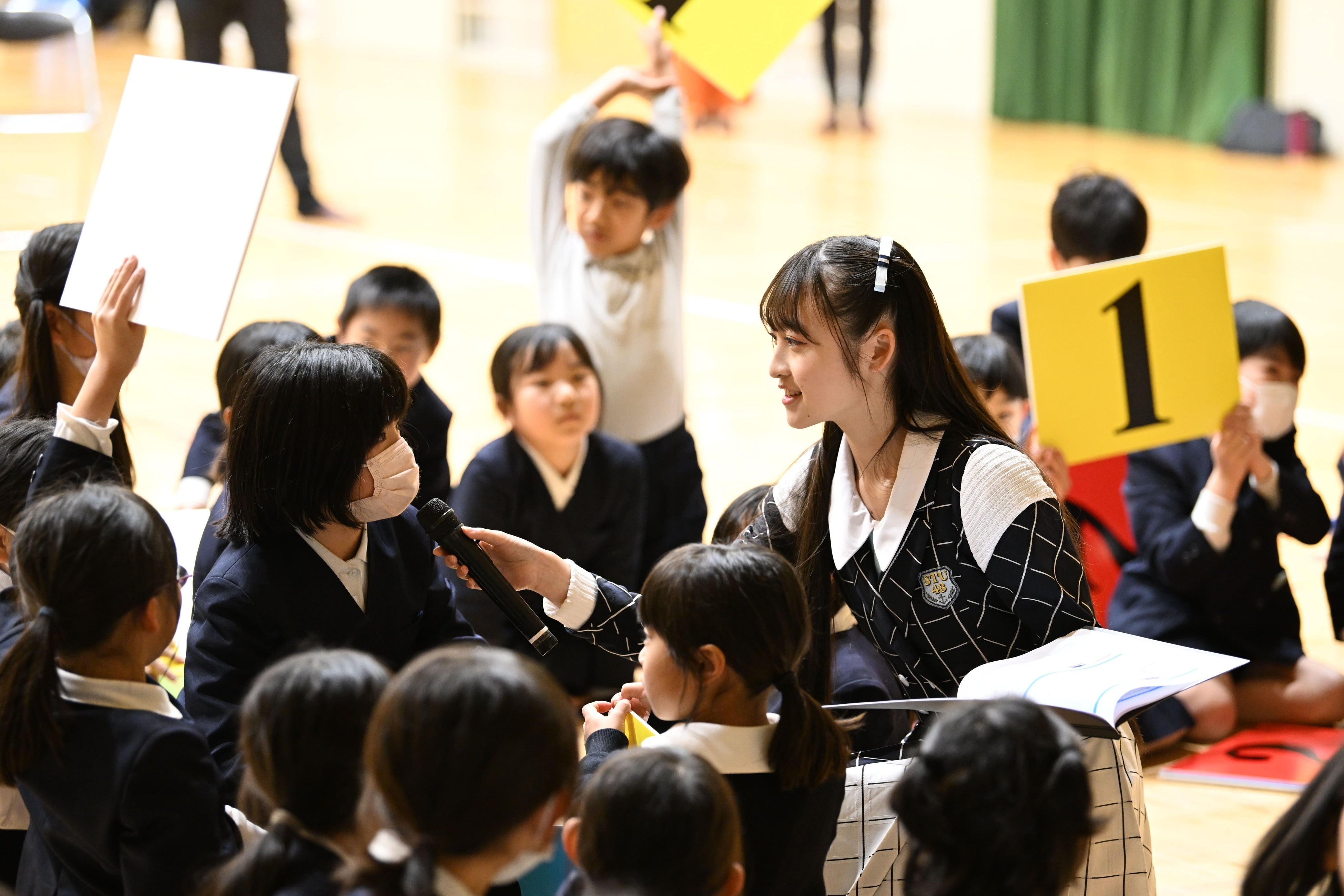 ■内容 :授業① 座学授業(海田東小学校体育館にて実施)STU48と生徒のフォトセッション