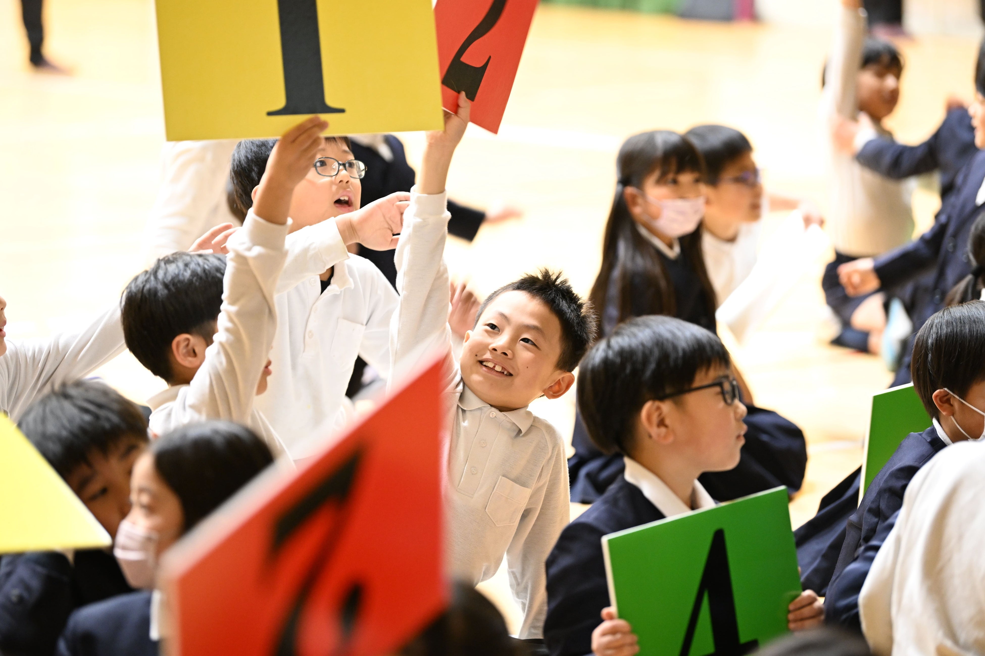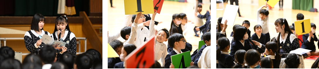 先生からの呼びかけでSTU48の3名が登場。「今日はみんなにとって身近な海の『瀬戸内海』を豊かにするために、できることを一緒に学んでいきましょう。」と意気込みを語りました。まず初めにSTU48メンバーが「海をたすけるももたろう」の物語の読み聞かせを実施。その後、生徒たちはグループに分かれて、海洋ごみに関する4択クイズを行いました。「瀬戸内海に年間どれくらいの量のごみが流れ込むか」といったクイズに、生徒たちはチームの仲間と悩みながら話し合いを行い、回答を導きました。正解したチームの子は「やったー!」と喜び、回答である年間のごみの量の4,500トンには「信じられない!」と驚きながらもクイズを楽しみました。