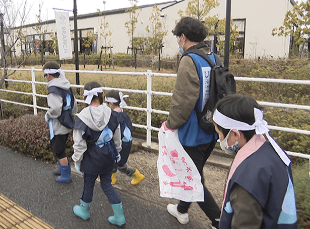 子どもたちがももたろうに変身して、通学路のごみを拾う課外授業を行います。
