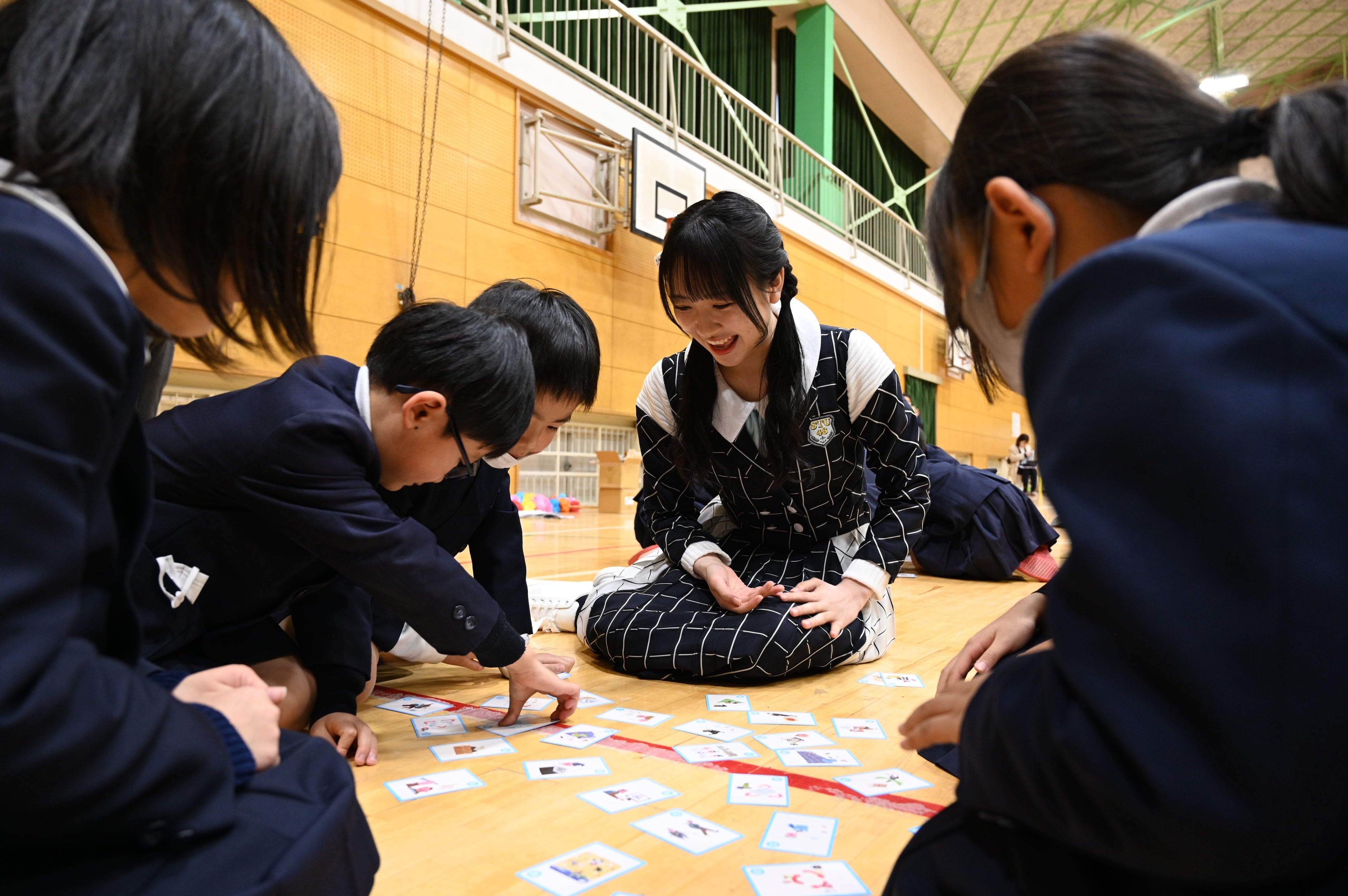 ことを教える動画や、「瀬戸内海おたすけかるた」を用いた授業を実施。STU48が札を読み、生徒たちはかるたを取り、楽しみながら海洋ごみに関する知識を深めました。かるたのカードが見つからない時は、チーム一丸で探し、すぐにカードが見つかった時は、拍手をしてお互いを称えあい大盛り上がりで終了しました。
