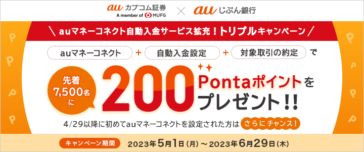 キャンペーン 概要 | キャンペーン1(https://kabu.com/campaign/20230501_2.html) または投資信託のスポット買付を約定したお客さまのうち先着7,500名さまに、 200Pontaポイントをプレゼント