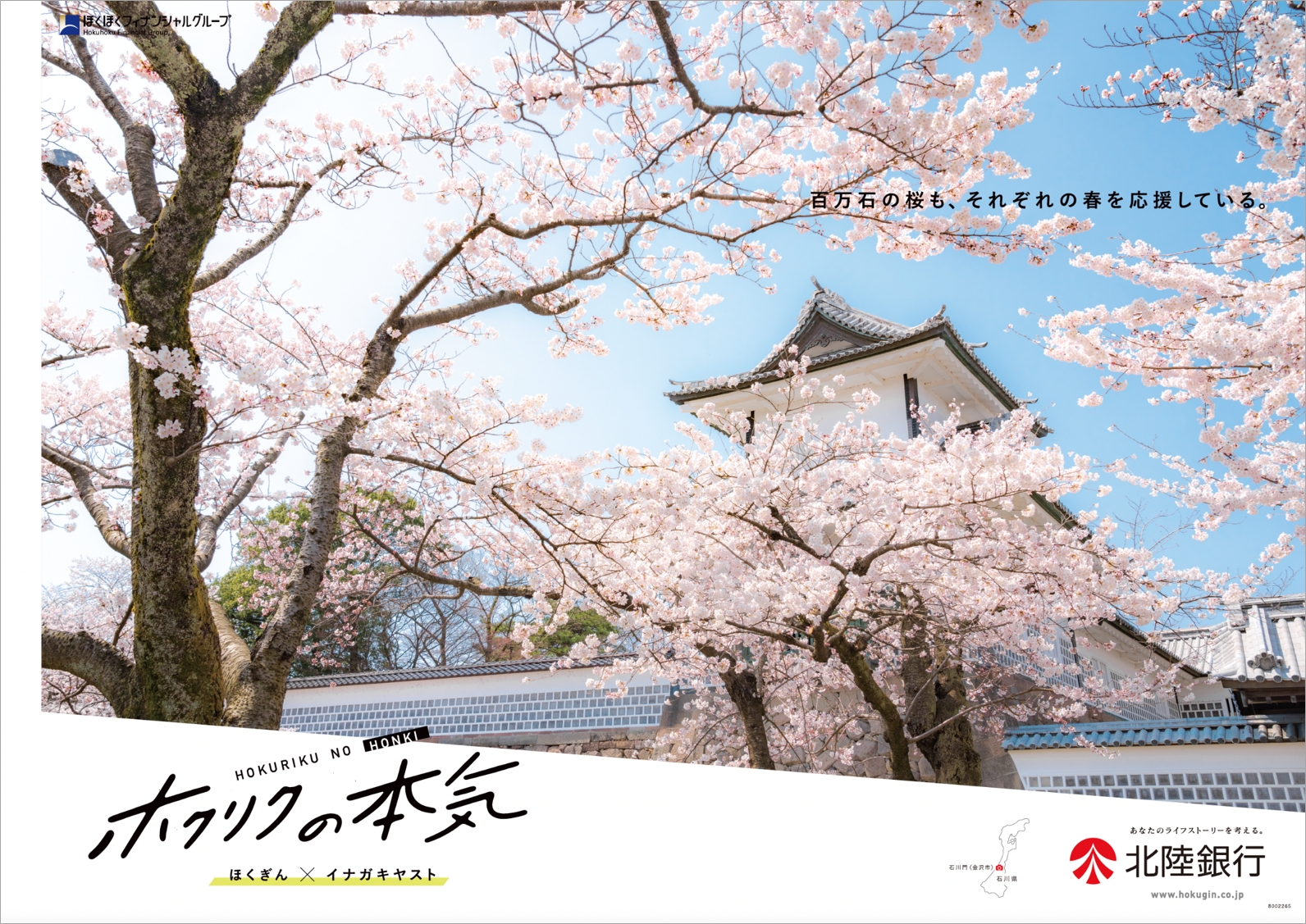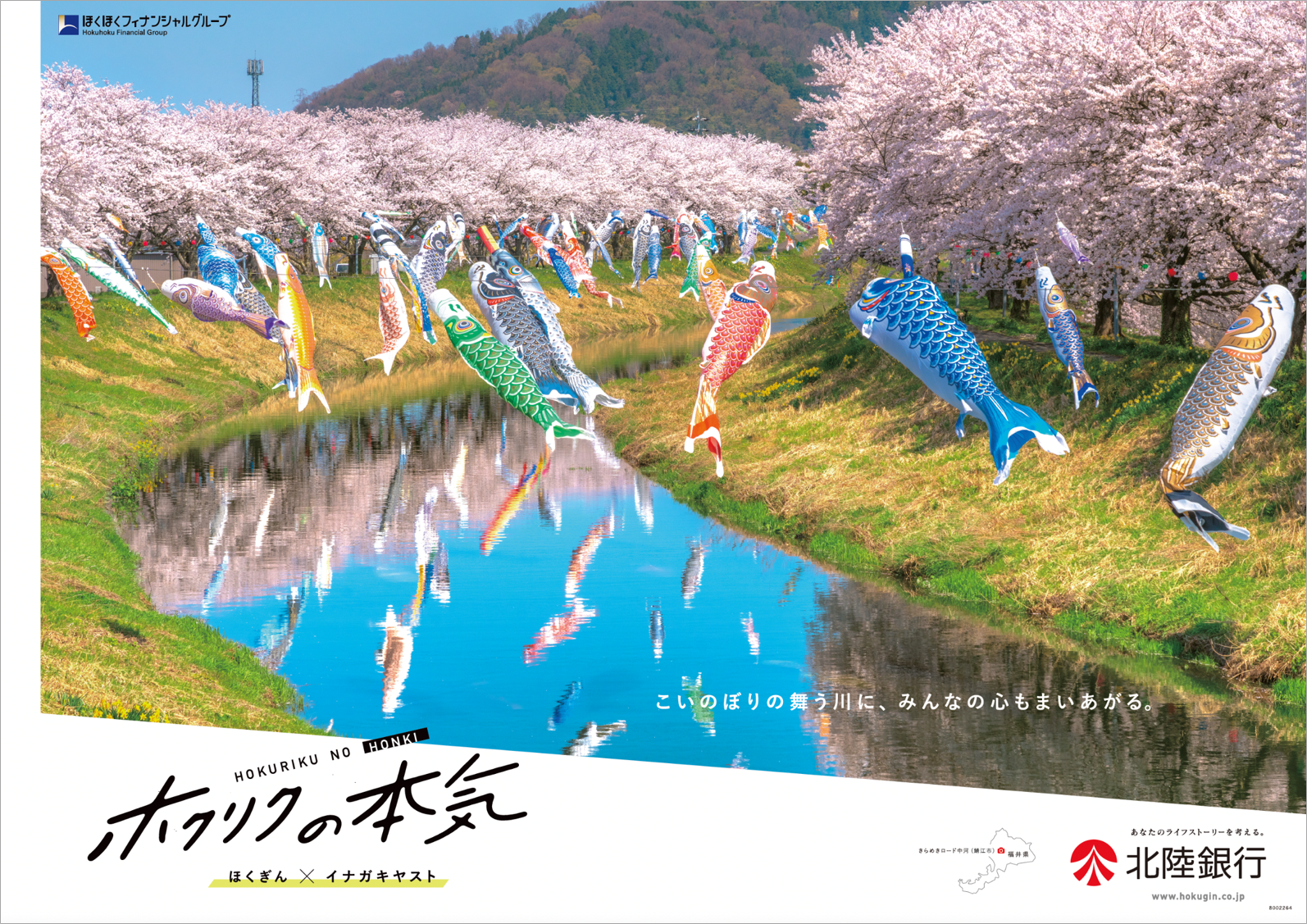 今回は石川県と福井県の風景を切り取った2作品を、北陸銀行ポスター等広告媒体で発信いたします。白壁と桜色の柔らかな彩りが優しい春を感じさせる作品と、満開の桜が映る川を鯉のぼりが泳ぐ姿が目を引く作品です。