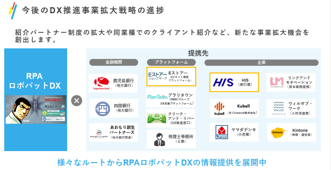 2022年10月のIPO以降、当社はロボパットDXの提供価値をより広く届けるため、直販の注力の外に、紹介パートナー制度の拡大と提携先の多様化を推進してまいりました。金融機関やDXプラットフォーム、各種企業との連携を通じて、現場課題に近い接点から導入検討のきっかけを増やし、導入検討から立上げまでの支援も含めた展開を進めています。これにより、業種・規模を問わず導入機会が拡大し、導入社数2,000社突破につながりました。