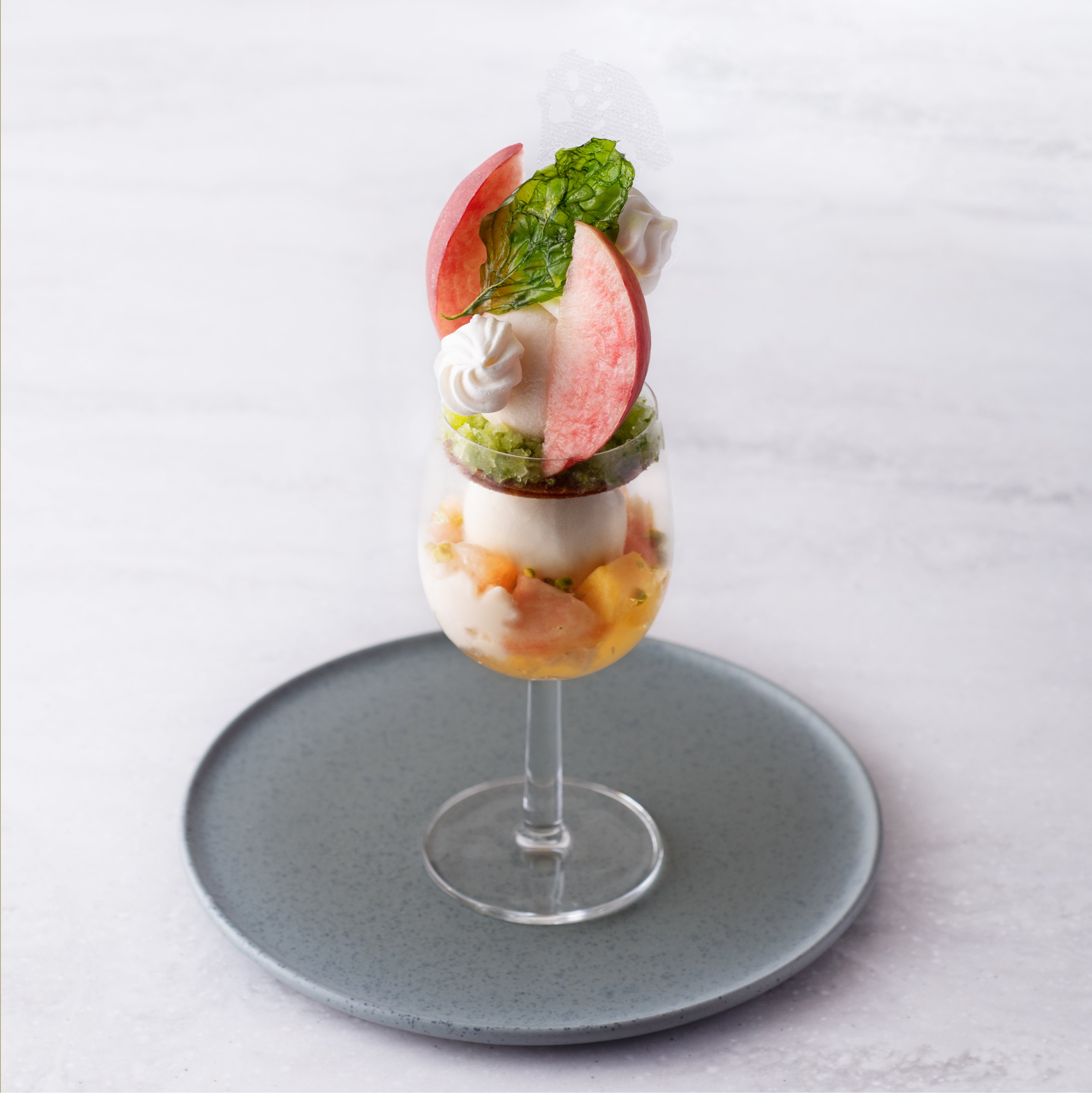 白桃のソルベとフロマージュブランのジェラートをメインに、グレープフルーツとバジルのグラニテを添えてさわやかな味わいに。底にはジャスミンの香りを効かせて、オリエンタルな余韻を意識しました。サラダパフェのような見た目で爽やかに、心も身体も喜ぶような桃パフェです。また、グラスの中にあえて作った余白の効果は、馬場麻衣子氏ならではのデザインになっており、新鮮な味わいと共に食べ進める楽しさを感じていただけます。