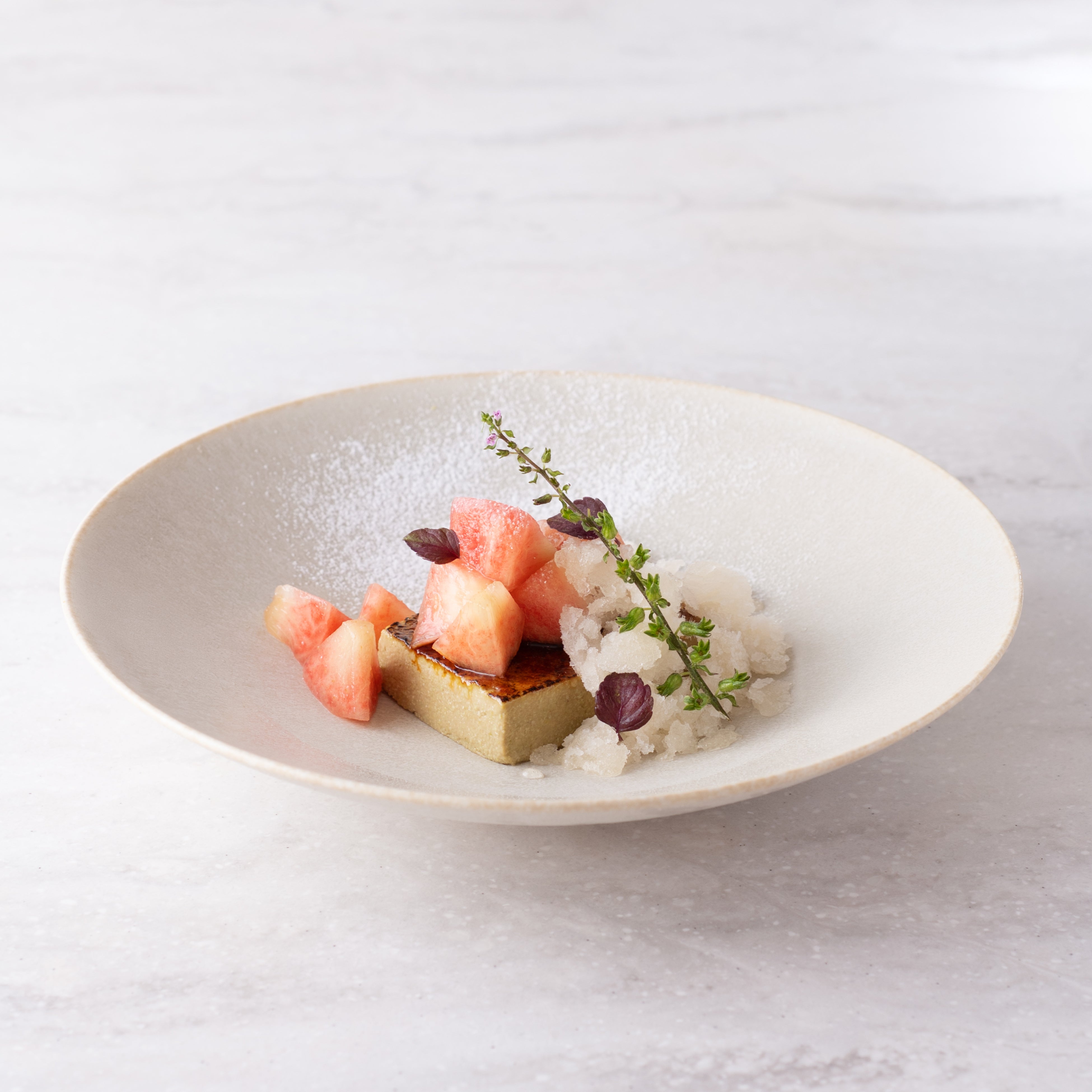 表面を香ばしくキャラメリゼした枝豆とピスタチオの「クレームブリュレ」に、甘やかな香りの桃のコンポートをたっぷりと添えて。桃のまろやかな食感とクレームブリュレのなめらかさが混ざり合い、お口の中で甘美にハーモニーが生まれます。桃のシロップと白ビールのグラニテを合わせながらお召し上がりいただく、夏らしく涼しげなひと皿に仕上がりました。