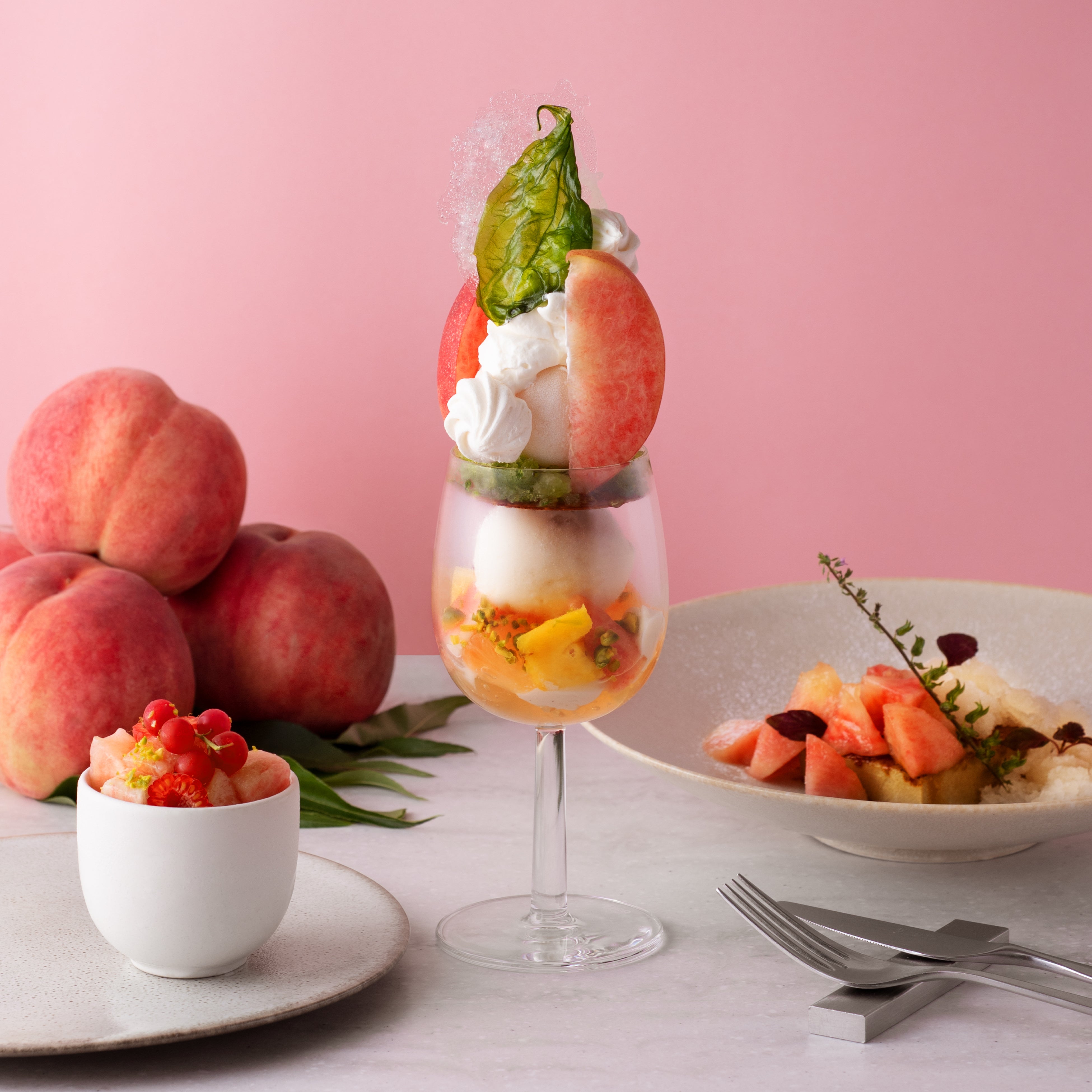 独特の甘やかな香りが魅力の桃は、繊細な味わいととろけるような舌触りが魅力。合わせる食材によっていろんな表情が味わえる稀有なフルーツです。当店でお出しするフルーツの中でも特に人気で、シェフの愛情もこだわりもひとしお。暑い夏も涼やかな気持ちで過ごせる、スウィートな桃のアレンジをご堪能ください。