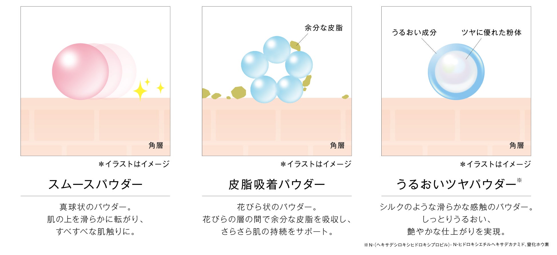 スキンケア後のべたつきや、皮脂によるべたつきを抑えつつ、艶やかな仕上がりを実現するため3種のパウダー(図3)でアプローチ。付けたときから時間が経っても快適な肌触りが続きます。