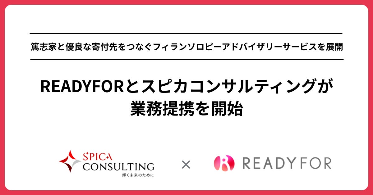 READYFOR株式会社(代表取締役CEO:米良はるか、以下「READYFOR」)は、株式会社スピカコンサルティング(代表取締役:中原 駿男、以下「スピカコンサルティング」)との間で、社会貢献・寄付活動に関心のある富裕層のフィランソロピーニーズに対応するため、フィランソロピー・アドバイザリー・サービスに関する業務提携契約を締結しました。