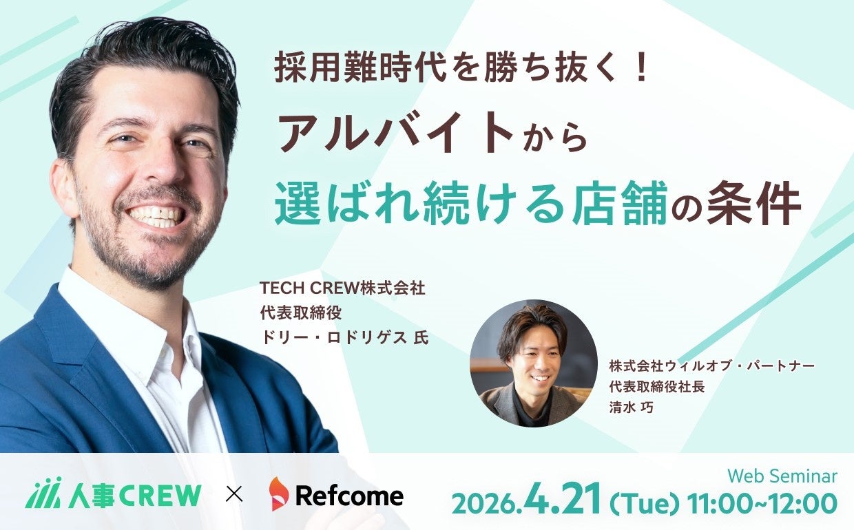 ウィルグループのリファラル採用を活性化させるクラウドサービス「Refcome(リフカム)」を提供する株式会社ウィルオブ・パートナー(本社:東京都新宿区、代表取締役社長:清水 巧)は、無料オンラインセミナー「採用難時代を勝ち抜く!アルバイトから選ばれ続ける店舗の条件」を2026年4月21日(火)に開催します。