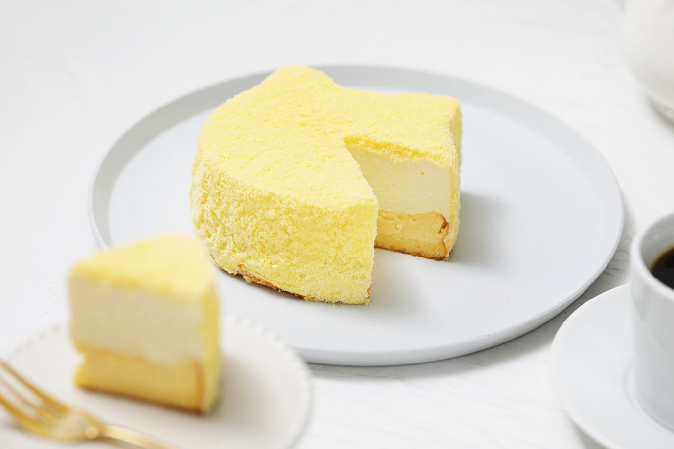中はレアチーズとベイクドチーズの2層仕立て。2層のチーズ生地の周りにスポンジクラムをつけることにより、外はふわふわ、中は濃厚な口どけをお楽しみいただけます。もふもふに仕上げたチーズケーキは、ねこちゃんのいる訪問先でのティータイムや、家族での団らんにもぴったり。