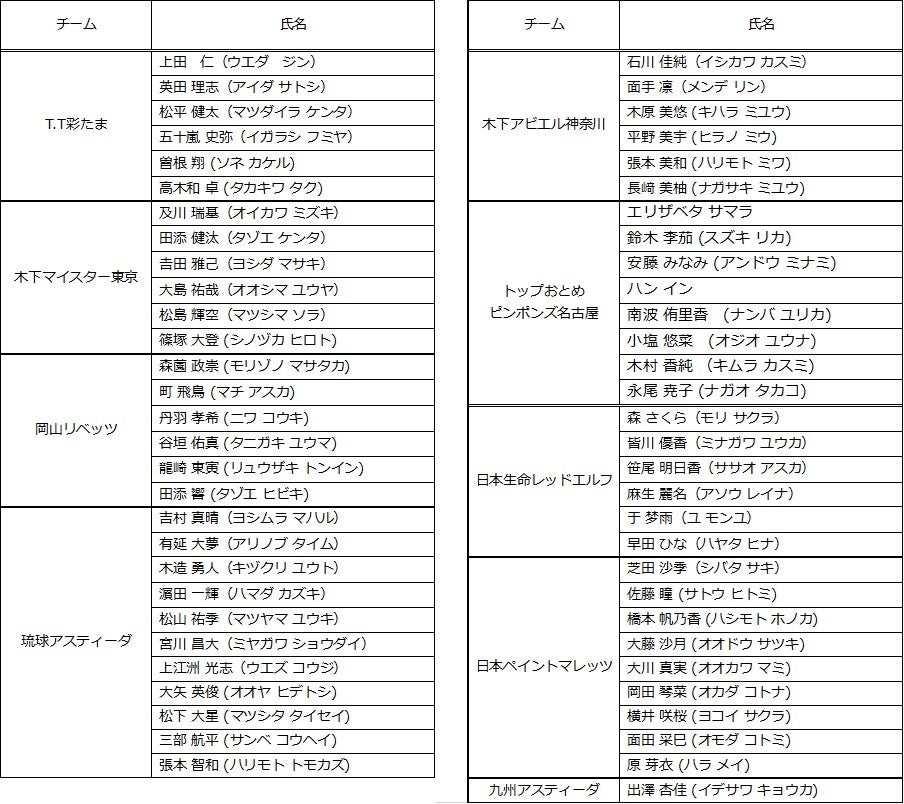 卓球のTリーグ 2022-2023シーズン 登録完了選手(2022年6月10日付)