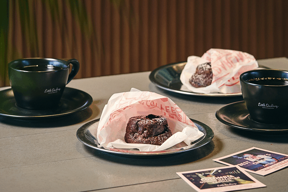 表面はしっとり、中はもっちり、ねっとり。塩麹をきかせた生地にセミドライイチジクとチョコチップを合わせ、ほのかに香るスパイスがイチジクの甘みを引き立てます。甘さと塩味のあいだに静かな余韻を残し、焙煎の香りとともに楽しむ秋の午後にぴったり。Little Darling Coffee Roastersで提供しているハワイアンスコーンなどのベイクと被らないよう「イチジク×チョコ」という組み合わせを選び、さらにコーヒーとの相性も考えて甘さや香りのバランスを丁寧に調整しました。