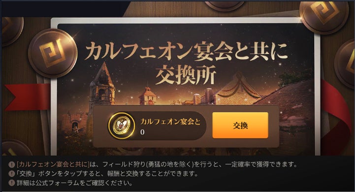 イベント期間中、フィールド狩り(勇猛の地を除く)を行うと、一定確率で「カルフェオンと共に」を獲得できます。この「カルフェオンと共に」は、イベントページの「交換」ボタンからお好きなアイテムと交換できます。