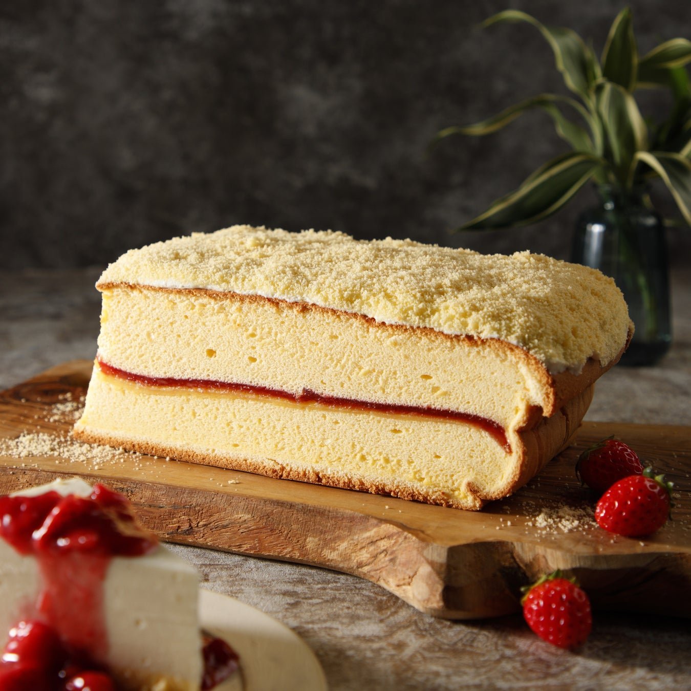 内容:プレーンとチーズケーキ風味の二層カステラの中に、自家製ベイクドチーズシートと苺ジャムを忍ばせました。 仕上げに、ふんわりほろほろのケーキクラムをトッピング。とろけるような口どけと、濃厚なチーズのコクが広がる贅沢なフロマージュカステラです。