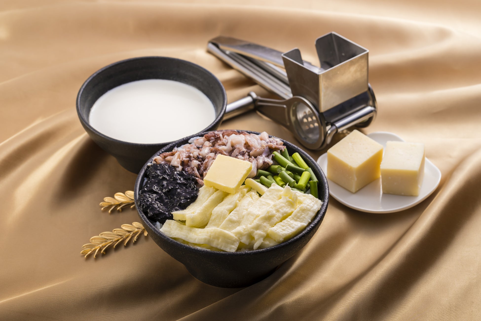 内容:モッツァレラチーズ、イカスミ、ゲソなどをホワイトソースで混ぜ、粉チーズをかけてリゾットに。もんじゃの〆にぜひ!