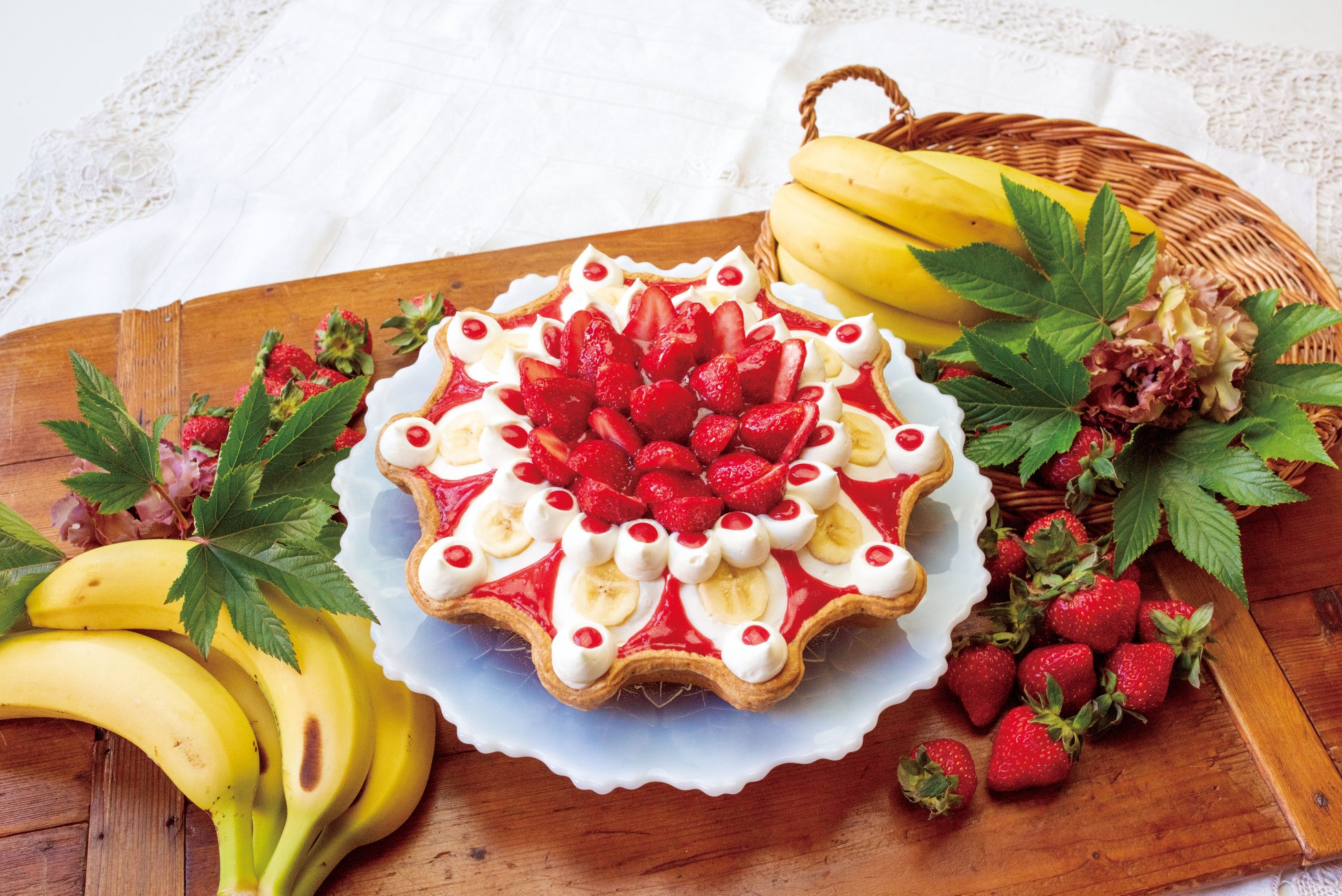 内容:バナナ風味のレアチーズにたっぷりのホイップとイチゴをトッピングした絶品タルト。クリーミーで爽やかな味わい。