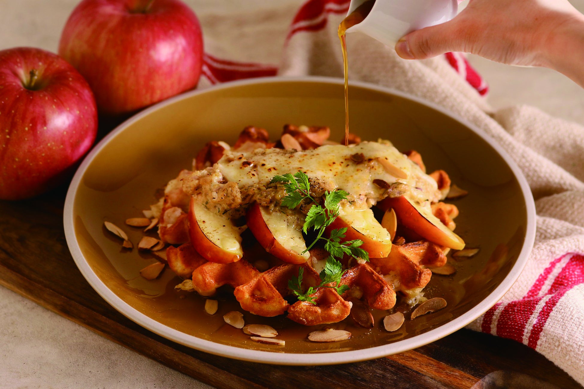 内容:ハーブ香るツナと焼きリンゴにチーズをのせて。メープルシロップとチーズの甘じょっぱさがクセになるワッフル。