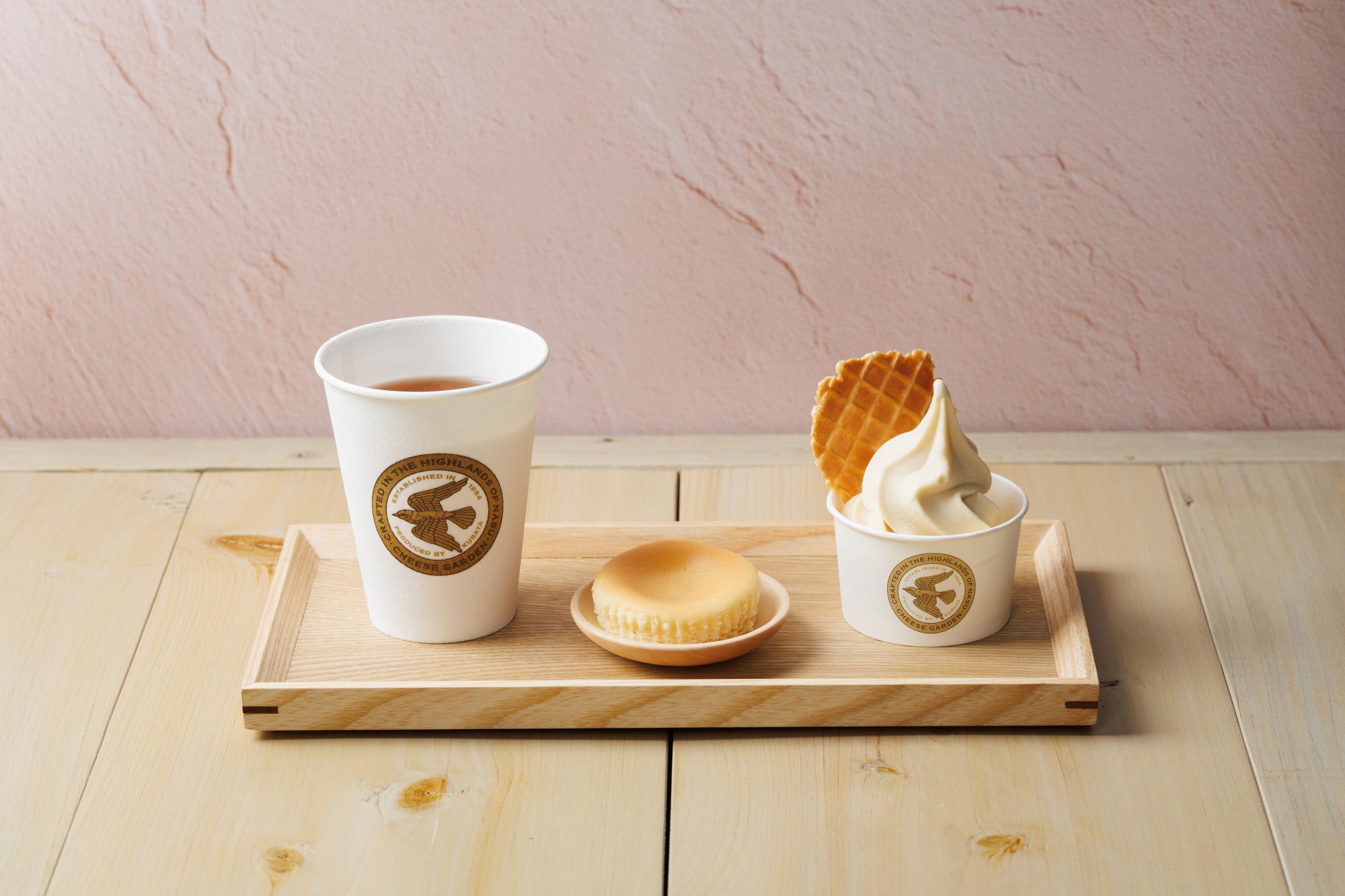 内容:人気の御用邸チーズケーキ(ミニサイズ)とチーズケーキソフトを、オリジナルブレンドティー「手茶」と一緒に堪能して。
