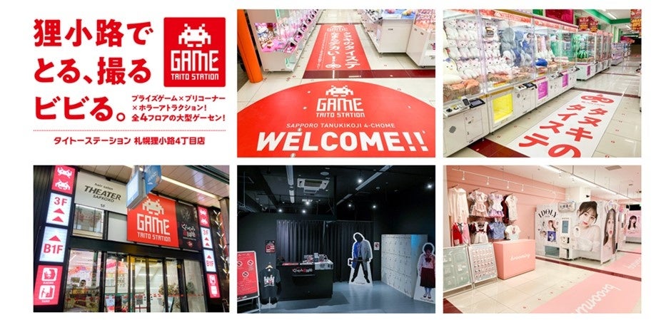 タイトーステーション 札幌狸小路4丁目店は、創立151周年の歴史を誇り、7ブロック総延長約900m店舗数約200軒のロングアーケードでもある札幌狸小路商店街内に新たにオープン。地下1階から3階までの4フロアに人気のクレーンゲームをはじめ北海道初上陸となるホラー・謎解き体験型施設「くらやみ遊園地」やプリントシール機専門店の「brooming」を併設。同じく狸小路商店街内の「タイトーステーション 札幌狸小路2丁目店」とあわせて、新たな体験やトレンドの発信を目指し、運営してまいります。