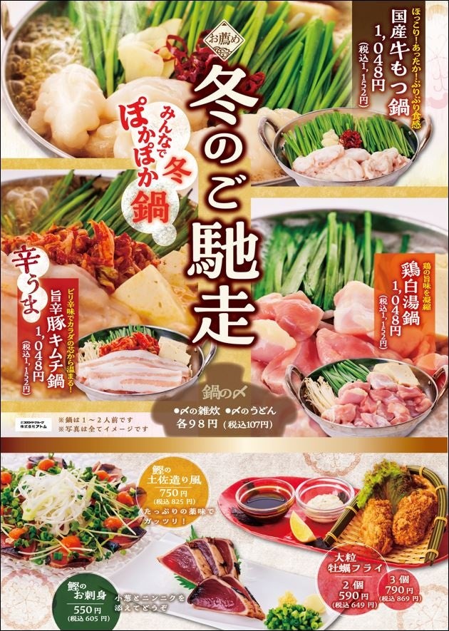 冬の味覚として「大粒カキフライ」を始め、鰹を使用した各種料理や定番あったか鍋、更に今なら「早得宴会コース」をご用意!