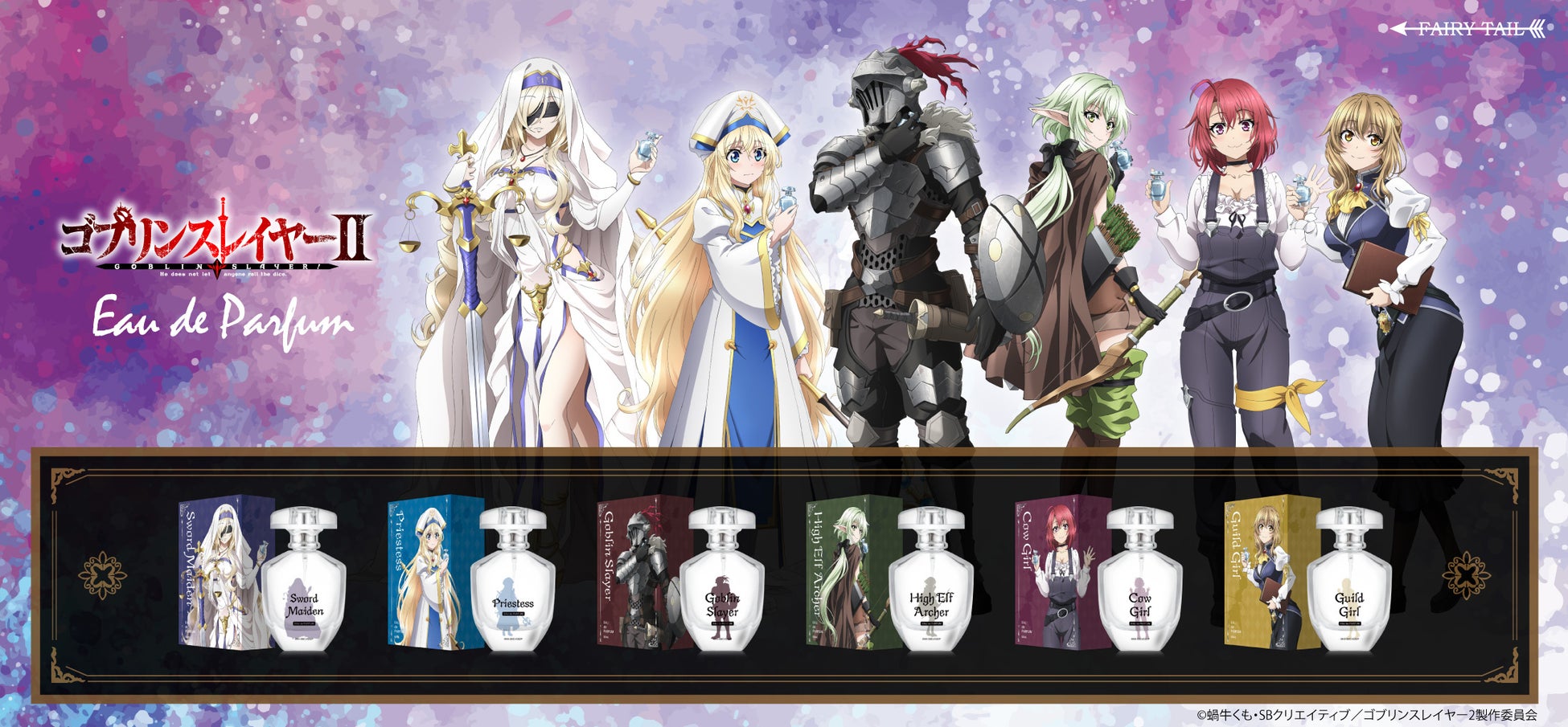 香水の輸入販売を手がけるフェアリーテイル株式会社(東京都港区)は、TVアニメ『ゴブリンスレイヤー』のキャラクターをイメージした香水を発売します。香水のパッケージには各キャラが香水を手に持った新規描き下ろしイラストを使用しています。