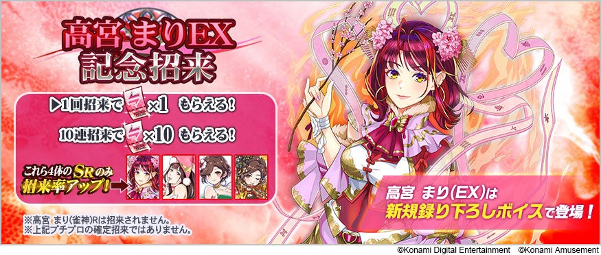 株式会社コナミアミューズメントは、モバイルゲーム『麻雀格闘倶楽部Sp(マージャンファイトクラブエスピー)』にて、日本プロ麻雀連盟所属で「麻雀格闘倶楽部」シリーズにも参戦している「高宮まりプロ」とのコラボレーションイベントを11月25日(月)から開催することをお知らせします。