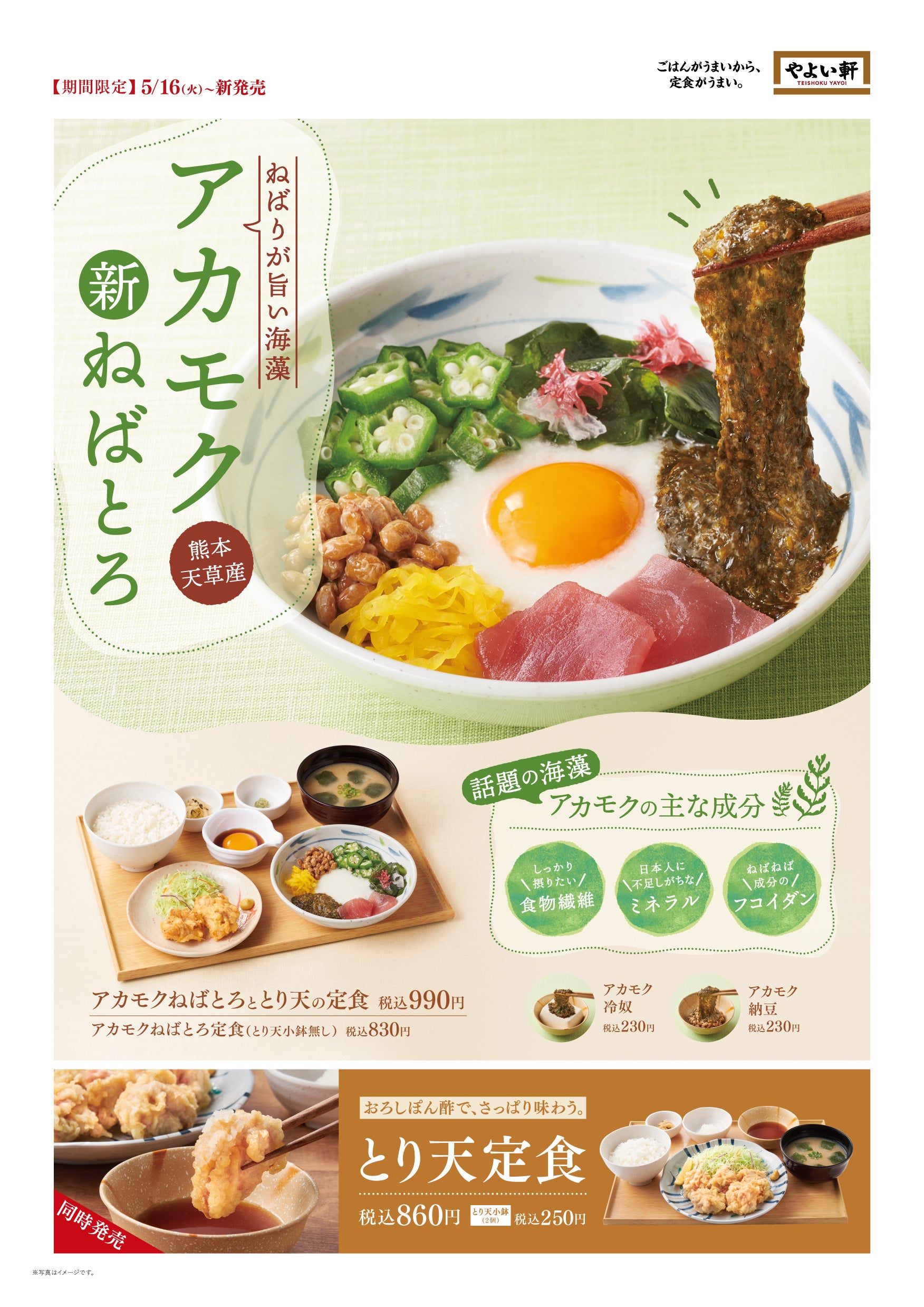 「やよい軒」話題の海藻”アカモク”を使った定食が初登場シャキシャキ食感とネバネバが美味しい”新”ねばとろ定食!『アカモクねばとろととり天の定食』5月16日(火)発売開始