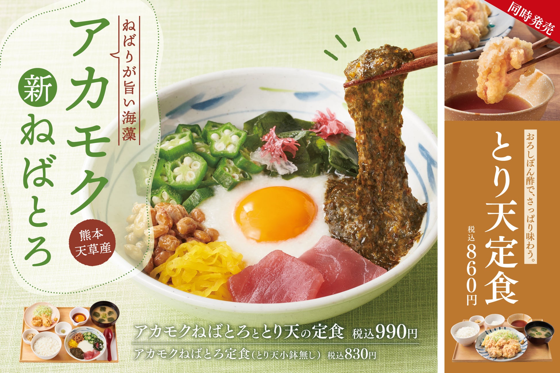 今回、「やよい軒」では定番の“ねばとろ”定食に、粘りとシャキシャキ食感が特長の熊本・天草産アカモクを使用することで、従来の“ねばとろ”に比べ、ネバネバ食感がパワーアップしました。納豆やとろろ、まぐろなどと混ぜ合わせ、ごはんにかけてお召し上がりください。また、ネバネバ食感との相性が良い、同時発売の『アカモク冷奴』、『アカモク納豆』も併せてお楽しみください。