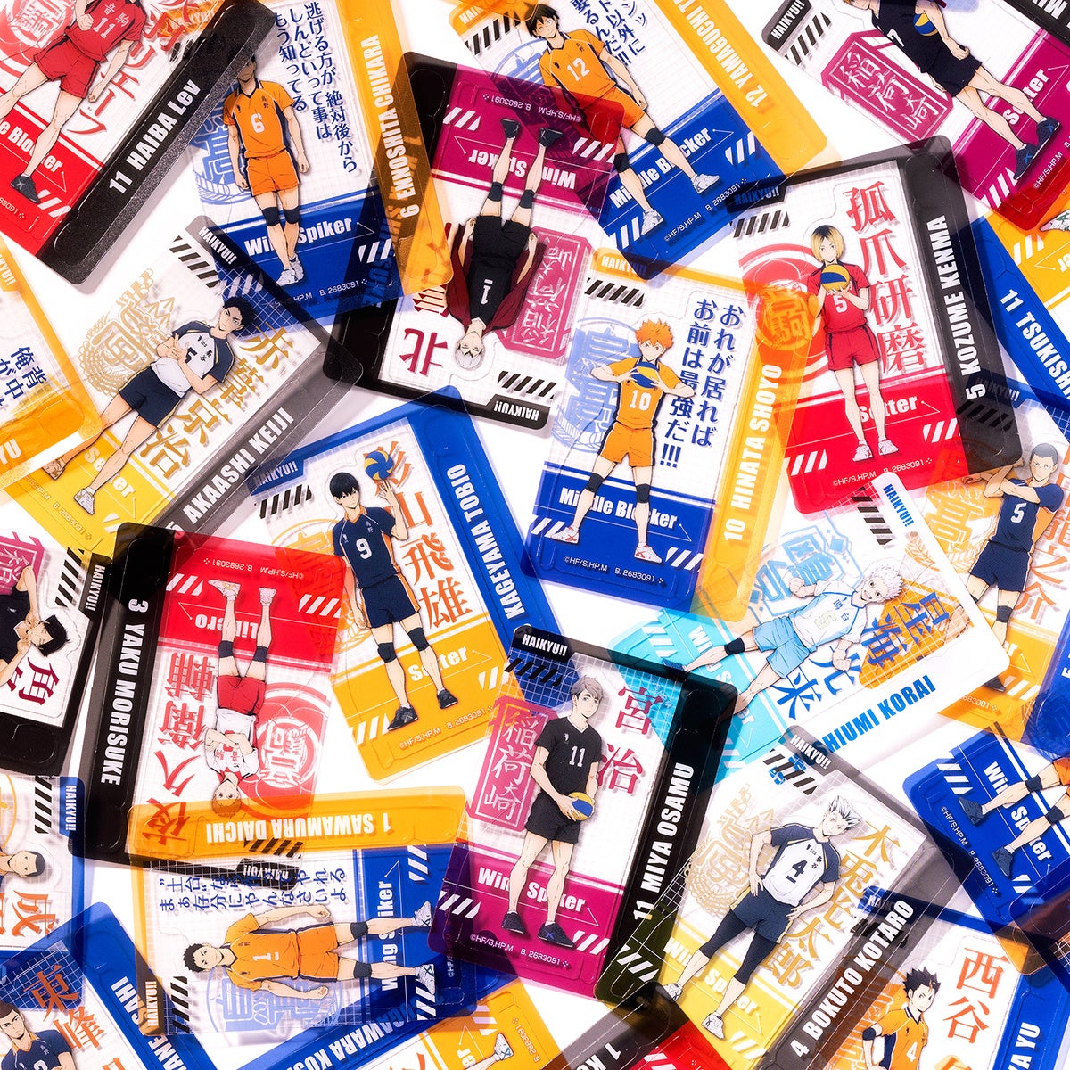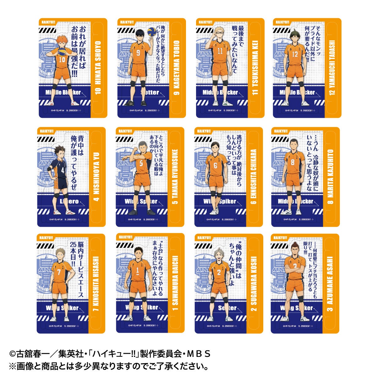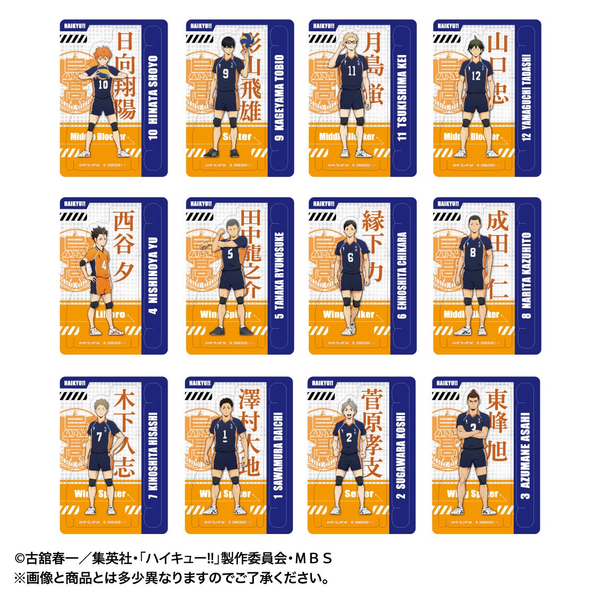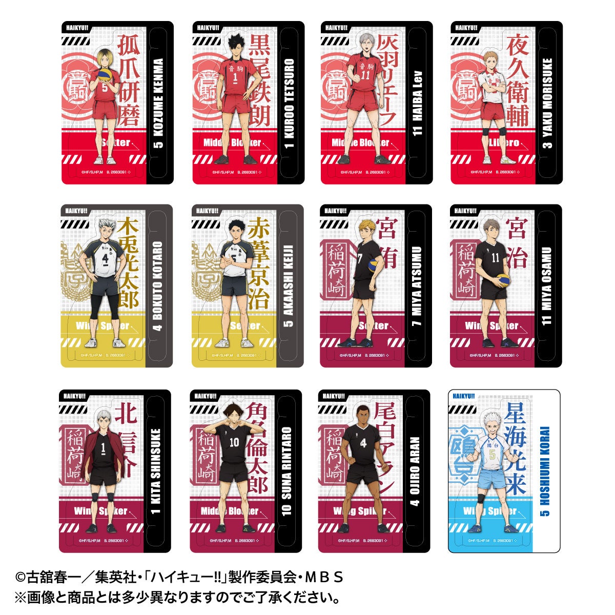 身長差を再現したラインアップです。背景にはキャラクター名称のほか、選手たちのポジション名の記載も。集めて並べたくなるデザインです。