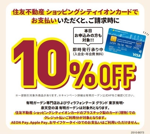 有明ガーデン内の店舗でおトクなサービスを受けることができる「住友不動産 ショッピングシティイオンカード」。本カードをお持ちいただくだけで、駐車場サービス(平日6時間無料、土日祝日4時間無料)が受けられます。さらに、クレジットのご利用金額に応じて有明ガーデンで使えるお買物・お食事券を進呈いたします。