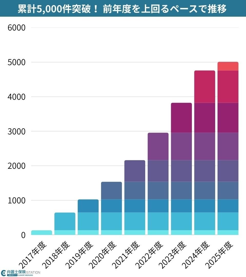 弁護士保険の比較サイト「弁護士保険STATION(https://bengoshi-h.info/)」を運営する《株式会社エレメント》(本社:神奈川県川崎市、代表取締役:近藤勉)は、本サイトを通じた弁護士保険の累計契約件数が5,000件を突破したことをお知らせいたします。