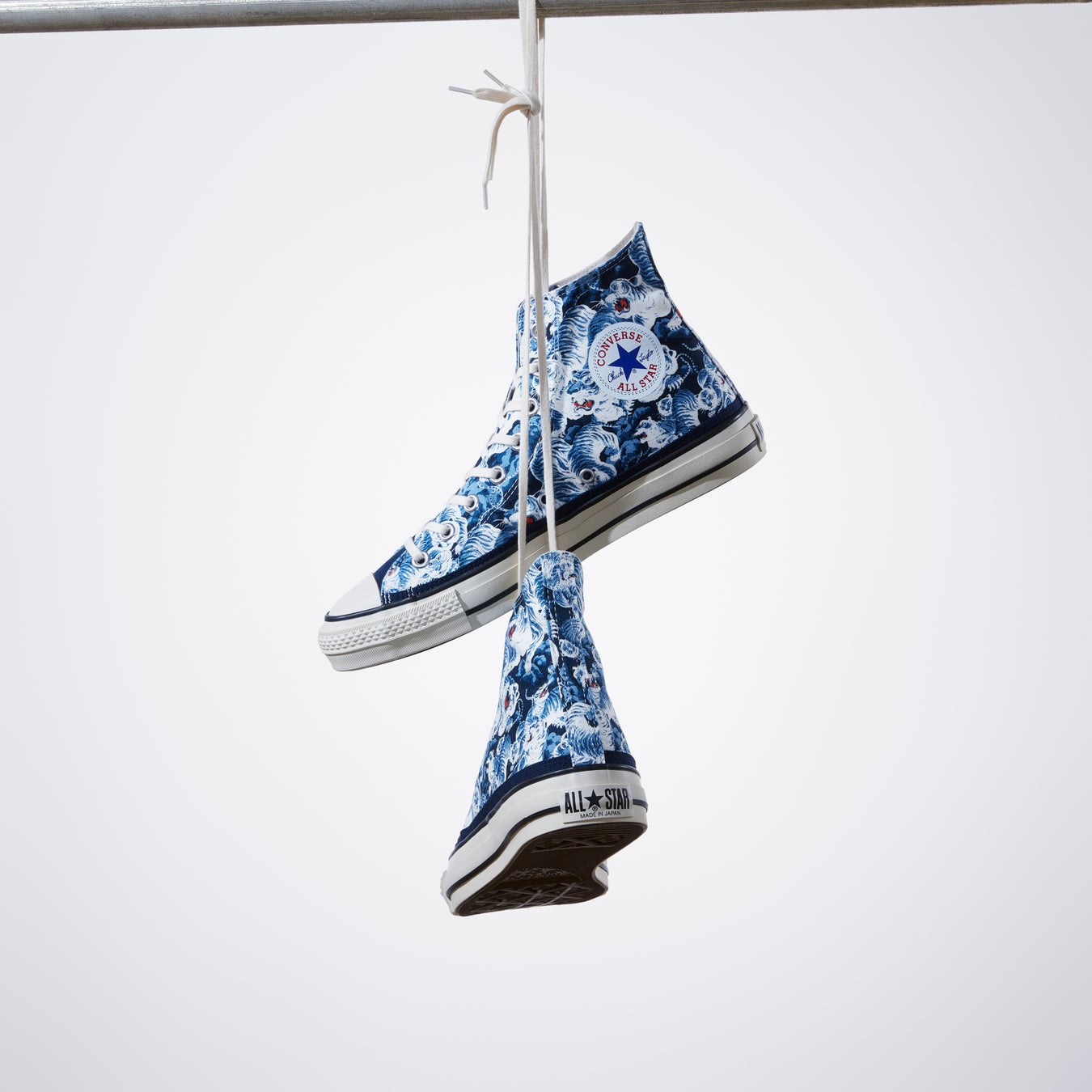 45周年を記念したオールスター「MADE IN JAPAN」モデルが登場。強靭な生命力で厄災を振り払い、家運隆盛を導く縁起物とされる虎をモチーフにした、和柄最高傑作ともいわれる伝統的な『百虎』柄をアッパーに採用。ヒールラベルには「MADE IN JAPAN」の印字を施し、トウキャップやテープ部分は、コンバースらしい生成りで仕上げ、ヴィンテージ感を演出しました。和柄の美しさを表現した日本ならではのデザインで、ヴィンテージ愛好家や海外のお客様にもおすすめの一足です。