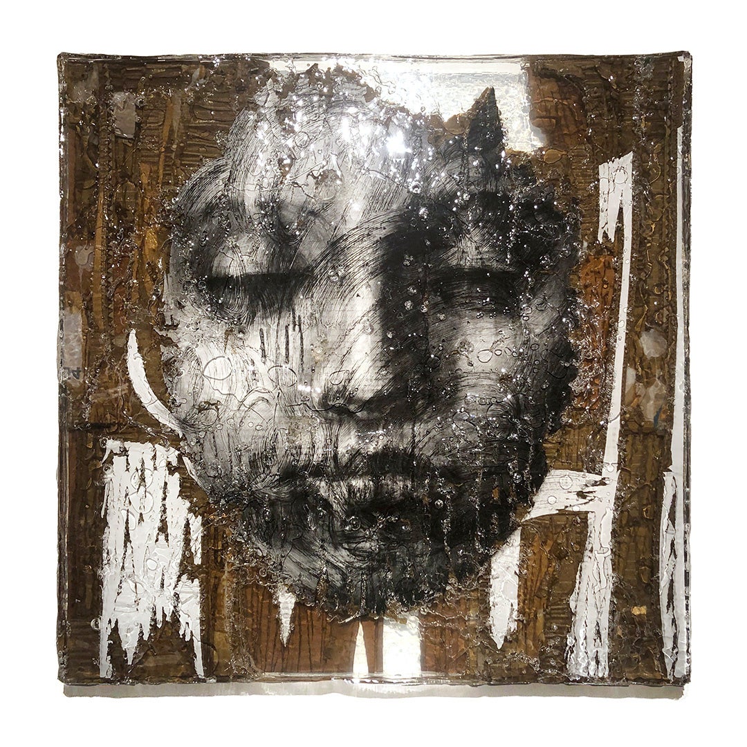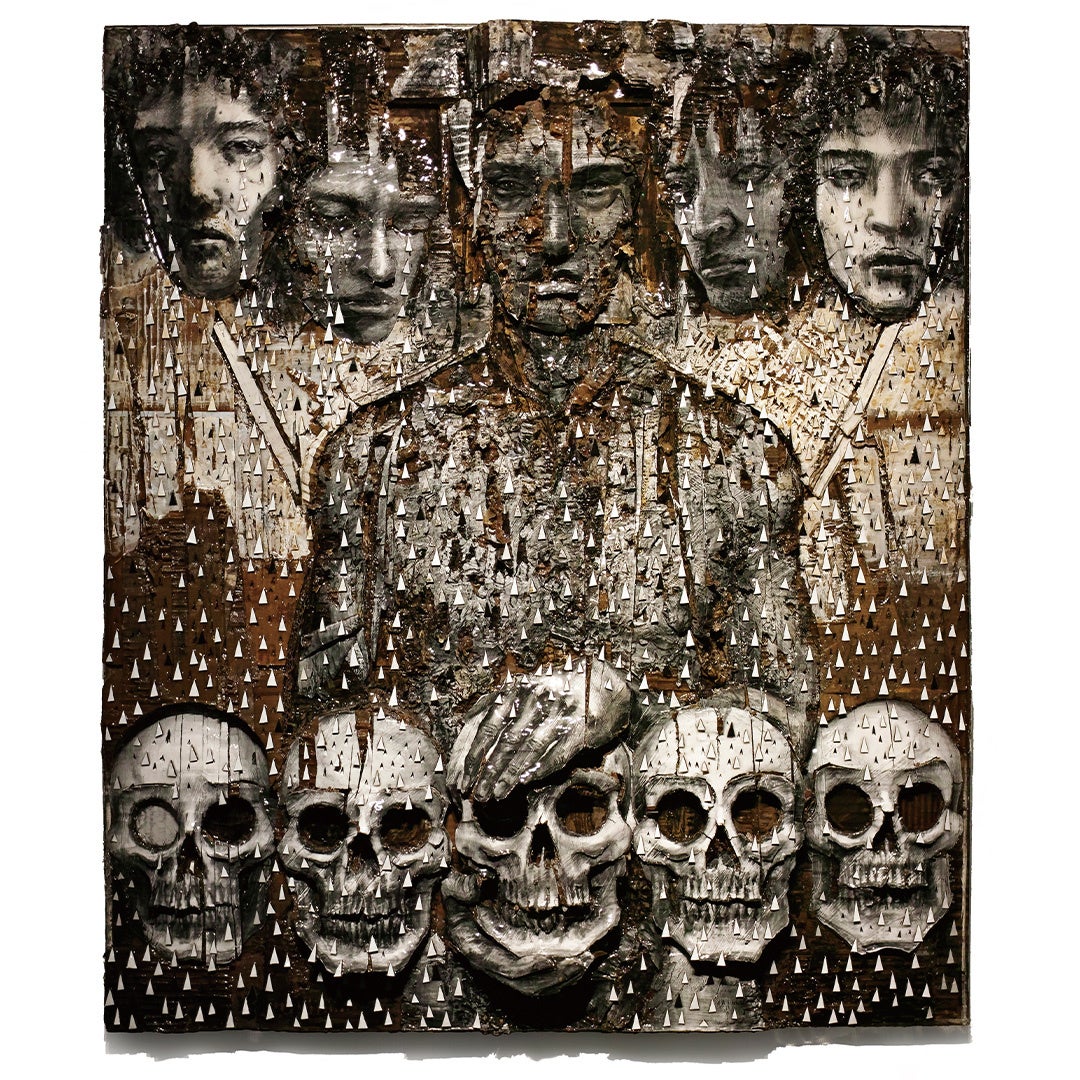 今回開催される個展「死と再生のイニシエーション」では、積層ダンボールに絵を完成させ、ナイフで絵を傷つけ、半立体に再構築、樹脂で硬化、という4工程で、誕生、死、再生、永遠を表現したシリーズ作品「RISIN 死と再生」を展示販売いたします。